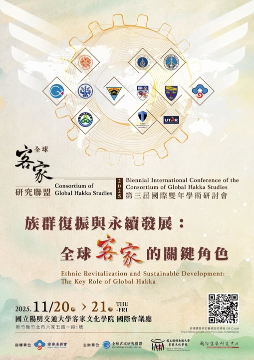 國立陽明交通大學與全球客家研究聯盟於2025年11月20日至11月21日於客家文化學院舉辦「2025第三屆全球客家研究聯盟國際雙年學術研討會」,敬請惠予公告並鼓勵踴躍參與