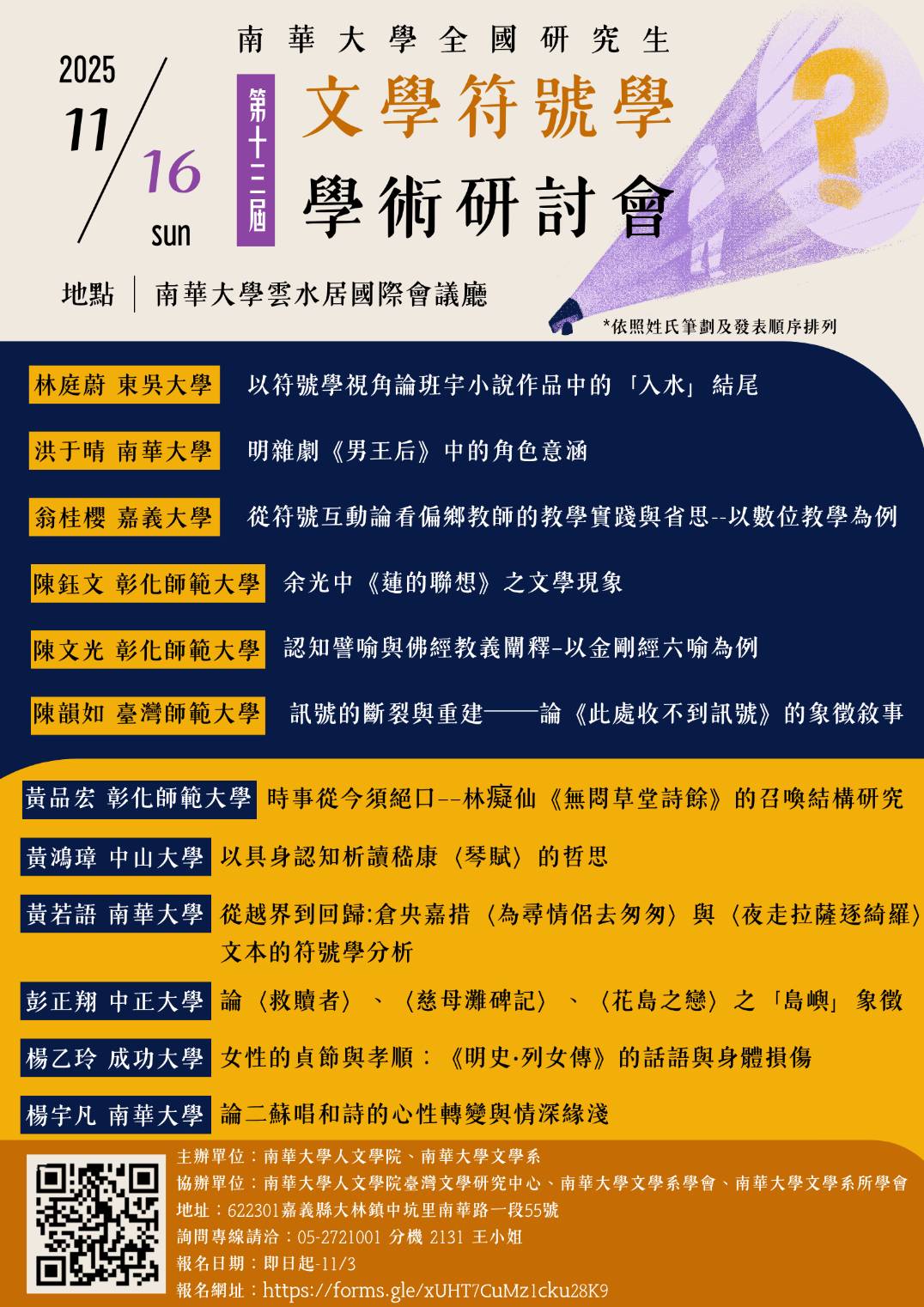 南華大學文學系舉辦「南華大學全國研究生第13屆文學符號學研討會」活動海報1份,鼓勵參加