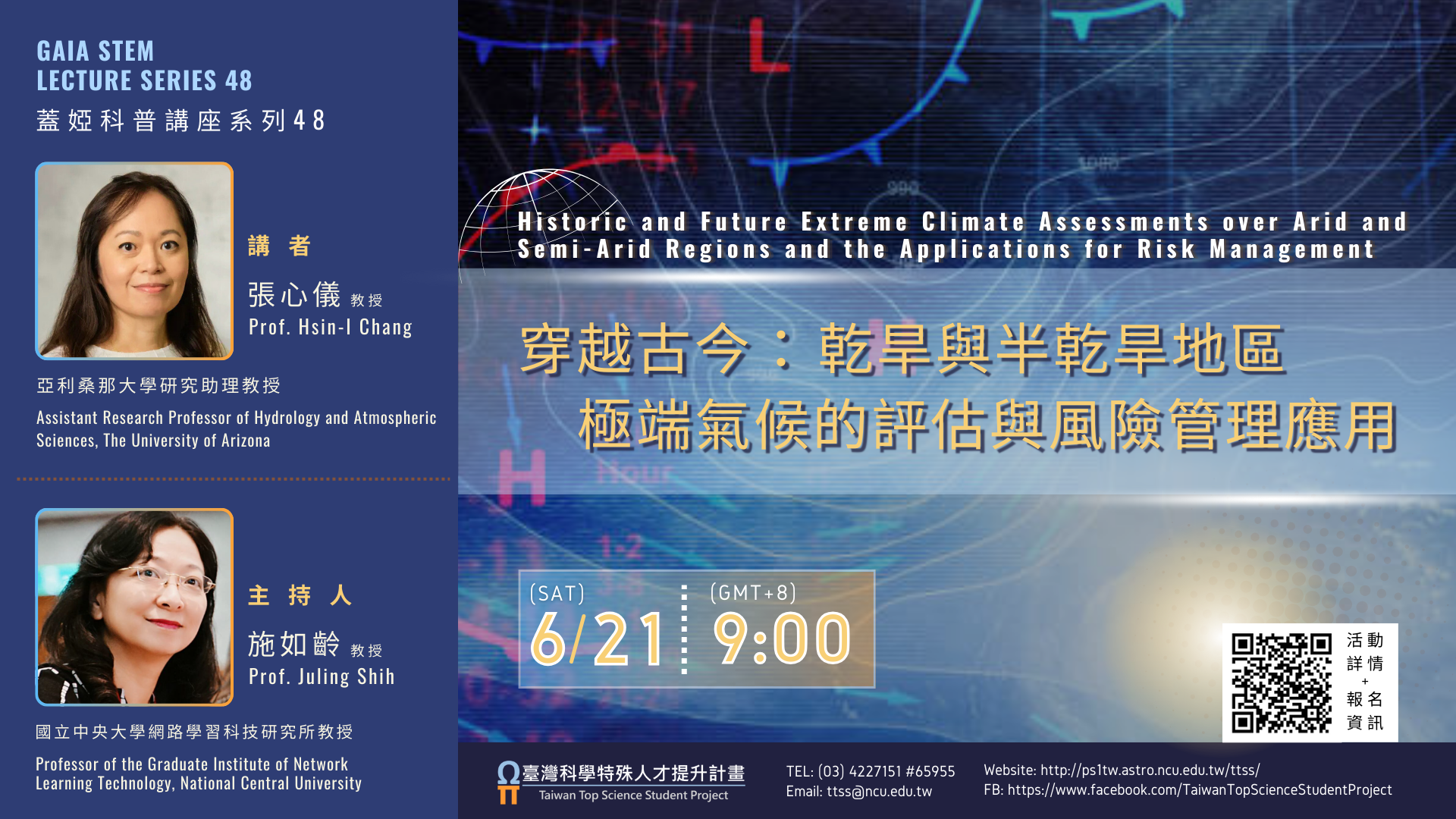 二、《蓋婭科普講座系列 48》活動訊息如下: (一)講者:張心儀教授 (亞利桑那大學)。 (二)講題:穿越古今:乾旱與半乾旱地區極端氣候的評估與風險管理應用。 (三)主持人:施如齡 教授 (國立中央大學網路學習科技研究所)。 (四)時間:114年6月21日,上午9時 (GMT+8)。