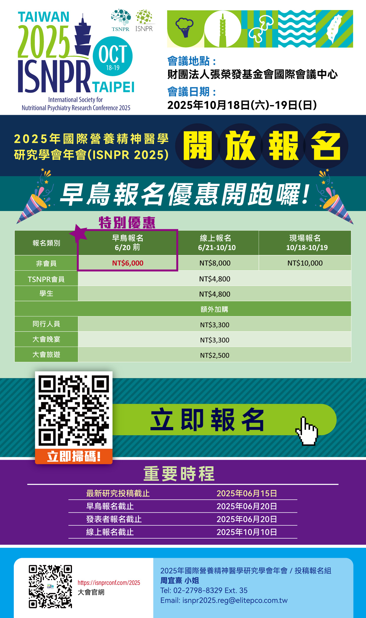 一、國際營養精神醫學研究學會(International Society For Nutritional Psychiatry Research; ISNPR)在全球轉譯精神醫學研究的進程中扮演領導角色,致力於整合神經科學、營養學、身心醫學與公共衛生等領域的研究成果。面對現行藥物治療的侷限,該學會積極推動營養介入作為大腦身心疾病預防與治療的創新策略,並進一步促進食品、營養及生活型態醫學等相關產業的創新與實務應用。 二、本次年會主題為「營養、精神醫學與心理健康的整合:邁向全人健康」,將於2025年10月18日至19日於台北張榮發基金會國際會議中心隆重舉行。 三、本次年會特別聯合舉辦2025年國際營養強化食品聯合會議(ISFPH 2025),預計將吸引來自國內外約500位專家學者齊聚一堂,共同探討營養與心理健康的跨領域整合之最新研究與臨床應用。會議內容豐富,涵蓋專業知識分享與臨床實務交流,並提供醫事人員繼續教育積分,誠摯邀請各單位人員踴躍報名參加,共襄盛舉,把握國際趨勢,促進營養精神醫學的學術發展與臨床應用。 四、為鼓勵台灣更多學者與臨床專家參與,本次年會提供專屬台灣與會者註冊優惠價,包括6/20前的早鳥優惠與學生註冊優惠等。詳情請參閱台灣營養精神醫學研究學會官網:https://tsnpr.org.tw/news/detail/226。隨函附上會議宣傳資料,敬請協助公告或轉知相關人員,誠摯邀請各界踴躍報名,共同參與此次盛會,攜手推動營養精神醫學領域的學術交流與臨床應用。 五、相關宣傳資料可參考本次年會官方網站之「宣傳資料頁面」:https://isnprconf.com/2025/webpage.php?id=18。 六、本次年會相關資訊請參閱官方網站:https://isnprconf.com/2025。 七、報名詳情如附件。