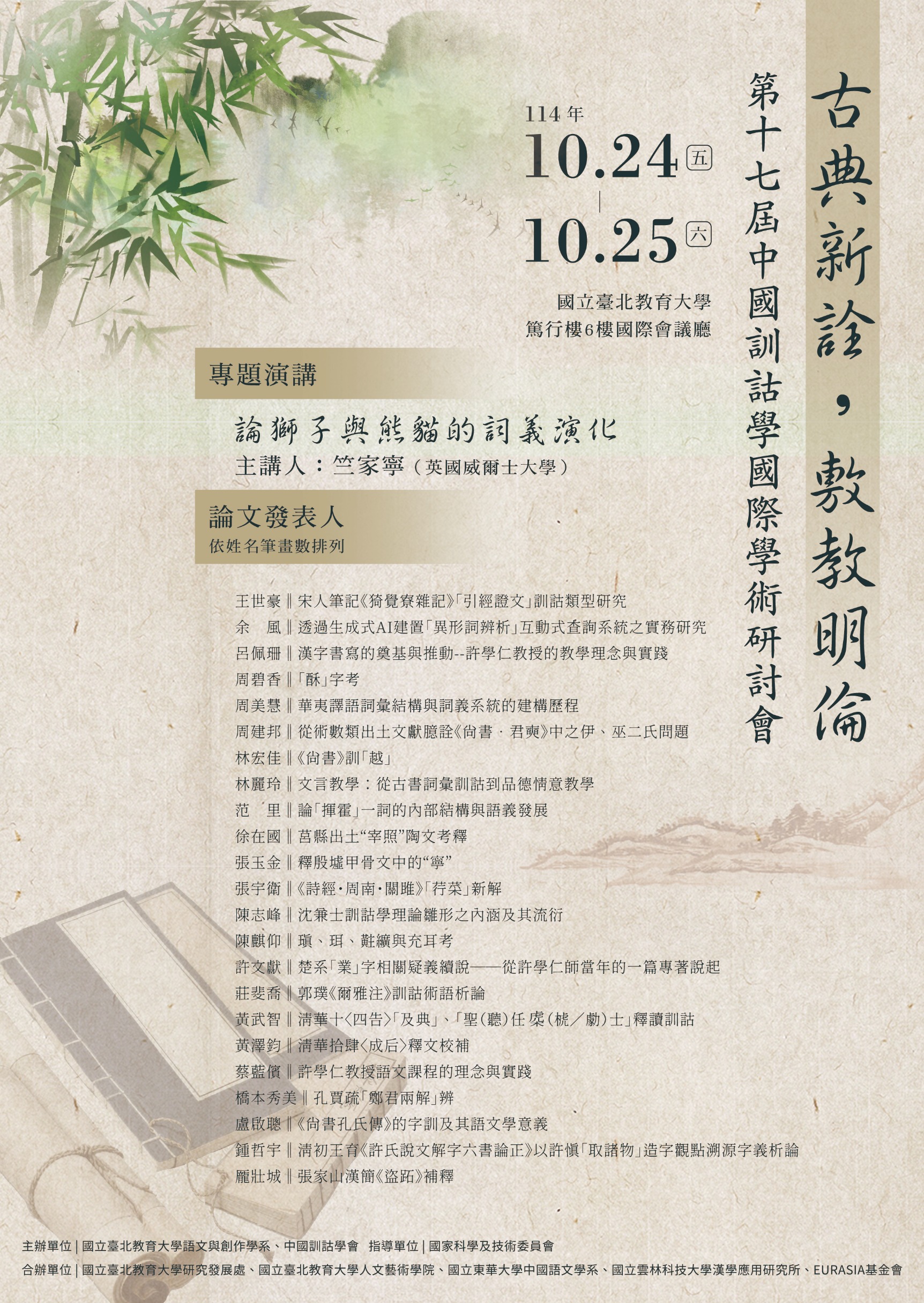 國立臺北教育大學語文與創作學系及中國訓詁學會共同舉辦「古典新詮,敷教明倫——第十七屆中國訓詁學國際學術研討會」,敬請惠予公告周知,並轉知貴屬鼓勵參加