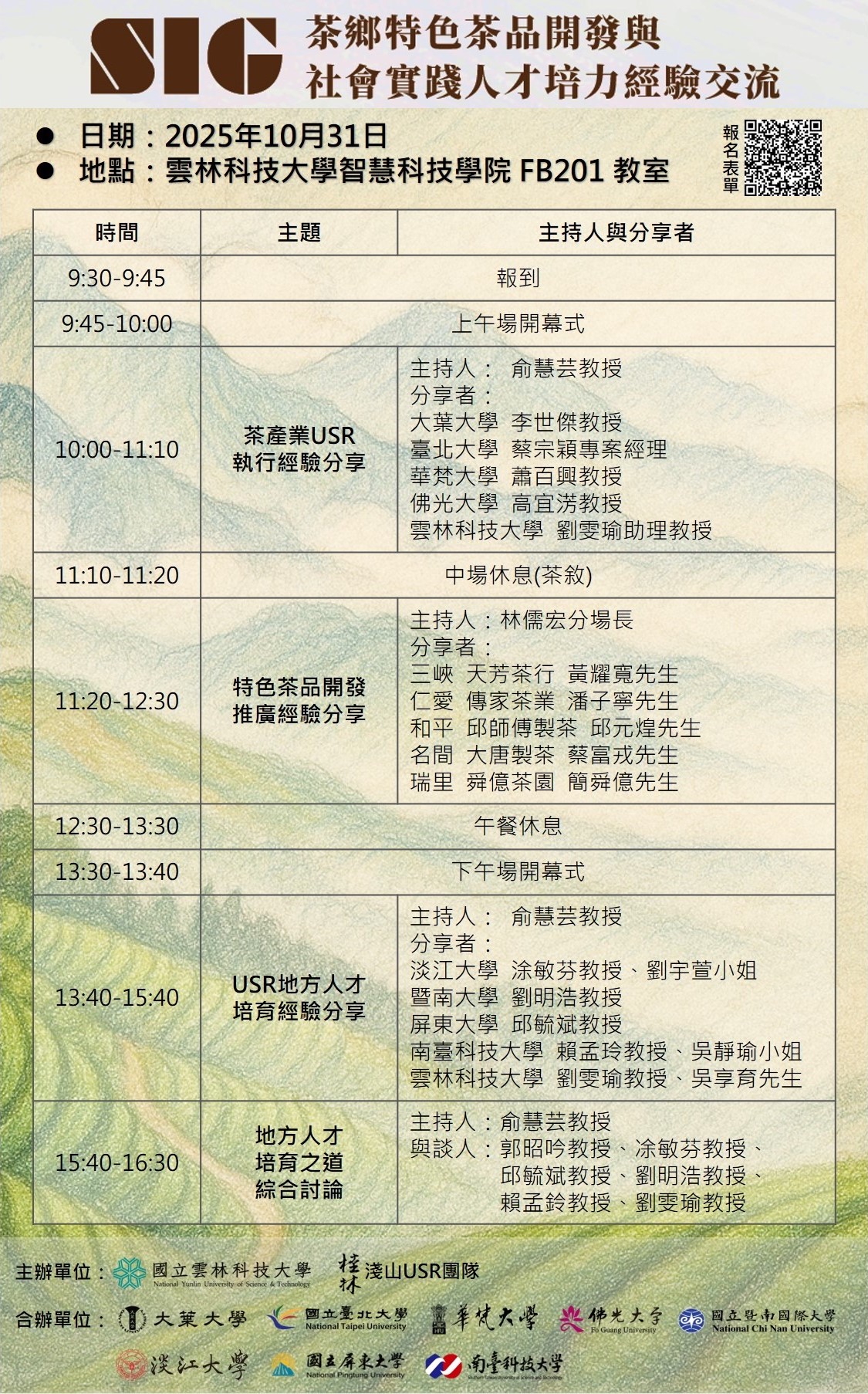 | 一、依教育部大學社會責任(USR)計畫辦理。 二、本次「SIG茶鄉特色茶品開發與社會實踐人才培力交流」活動,聚焦特色茶品開發、茶產業USR推動經驗與社會實踐人才培育等主題,誠摯邀請貴校師生踴躍報名參與。