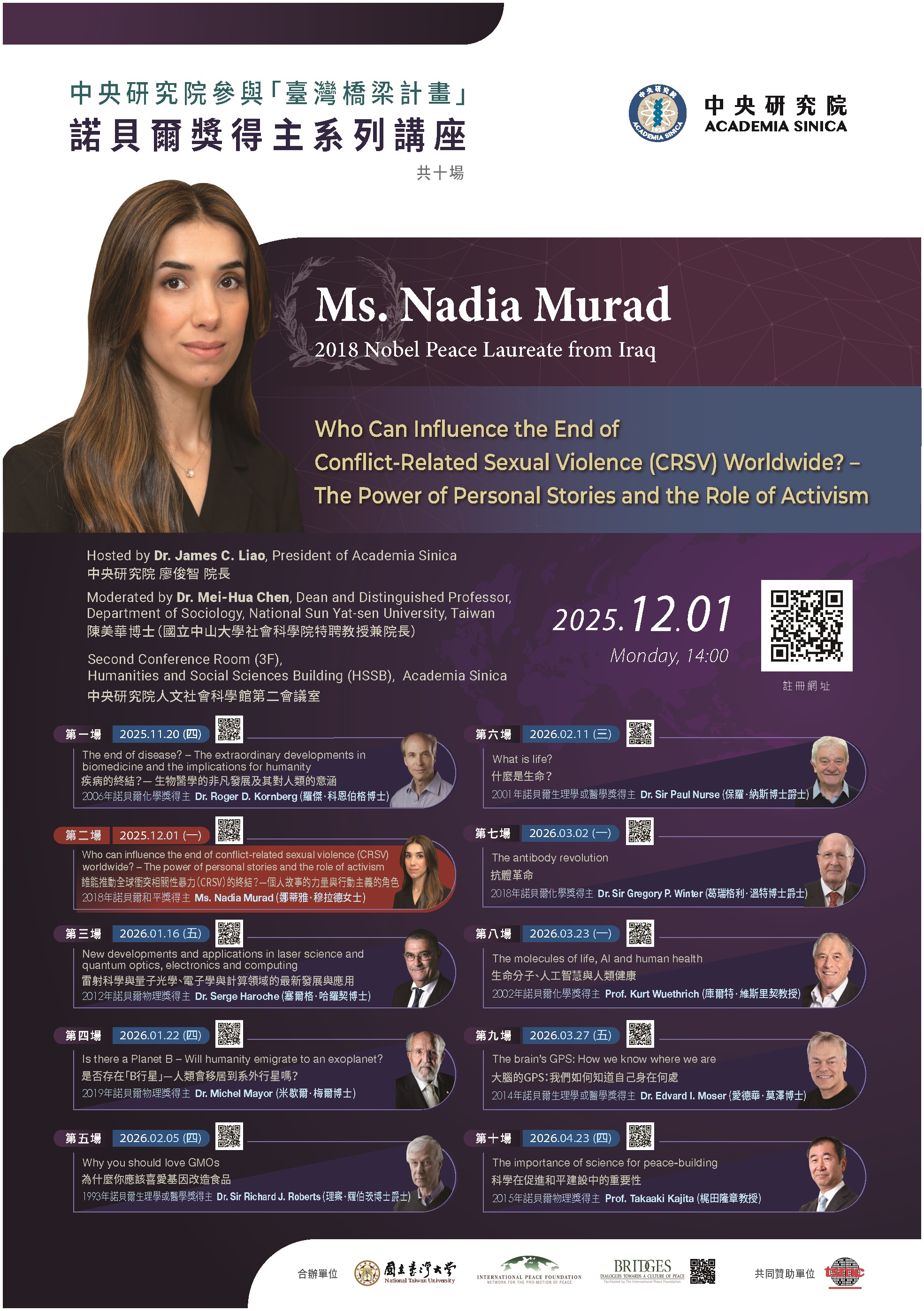 一、「臺灣橋梁計畫」自本(114)年11月起至115年4月,共將邀請 31 位諾貝爾獎得主訪問本院及全臺十餘所大學,相關資訊請參閱網站:https://www.peace-bridges.net/。 二、中央研究院將邀請其中10位蒞院演講與交流,第二場演講資訊 如下: (一)時間:中央研究院12月1日(星期一)下午2時整 (二)地點:中央研究院人文社會科學館三樓第二會議室 (三)講題:Who Can Influence the End of Conflict-Related Sexual Violence (CRSV) Worldwide? - The Power of Personal Stories and the Role of Activism(誰能推動全球衝突相關性暴力的終結?—個人故事的力量與行動主義的角色) (四)檢送演講海報電子檔1份,洽詢專線:中央研究院國際事務處,(02)27899895。 (五)報名網址:https://forms.gle/E2C4dAi9ewUimNb88 。