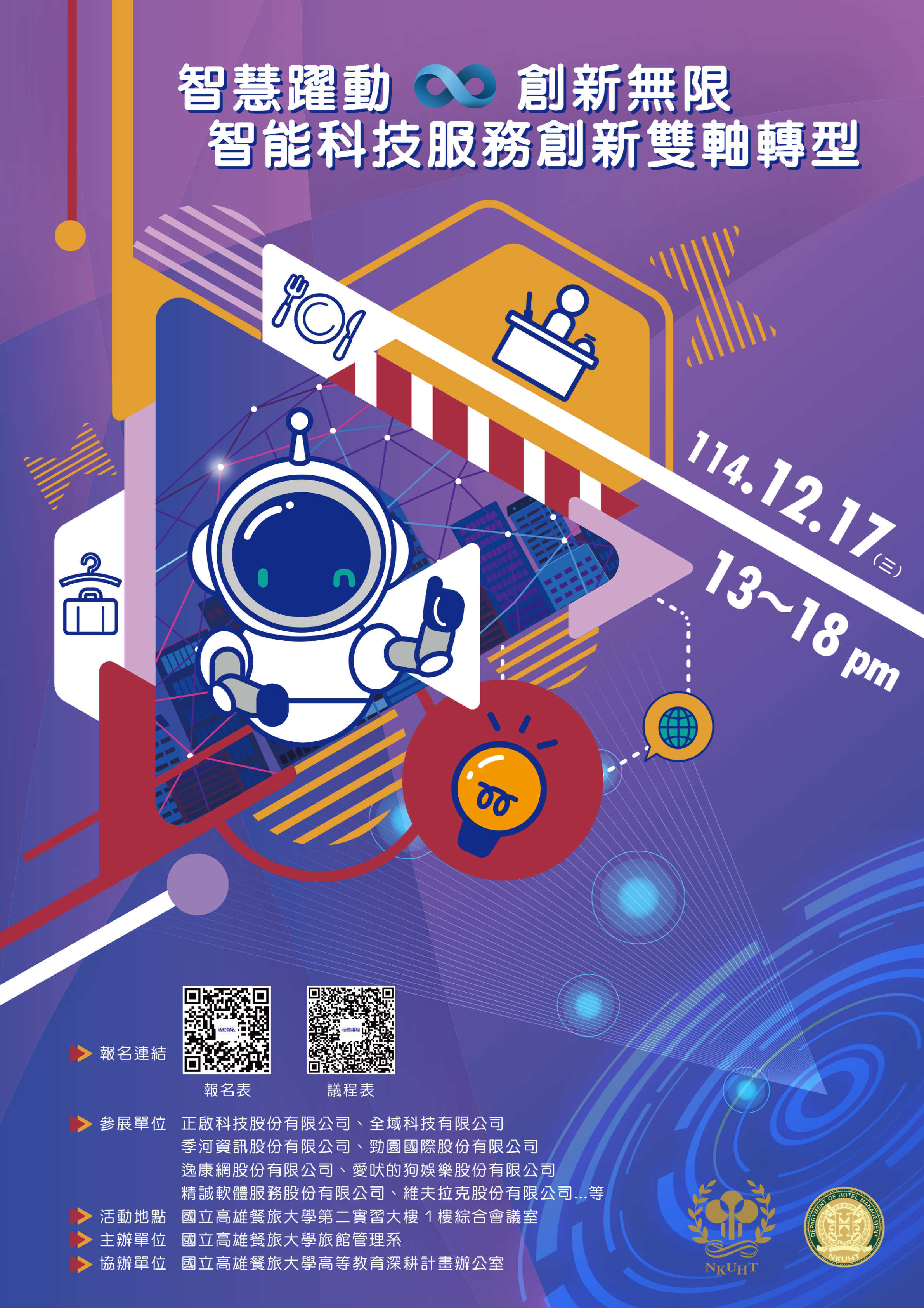 國立高雄餐旅大學檢送本校旅館管理系舉辦「智慧躍動 ️創新無限-智能科技服務創新雙軸轉型」活動海報1份,敬請惠予公告並鼓勵參與