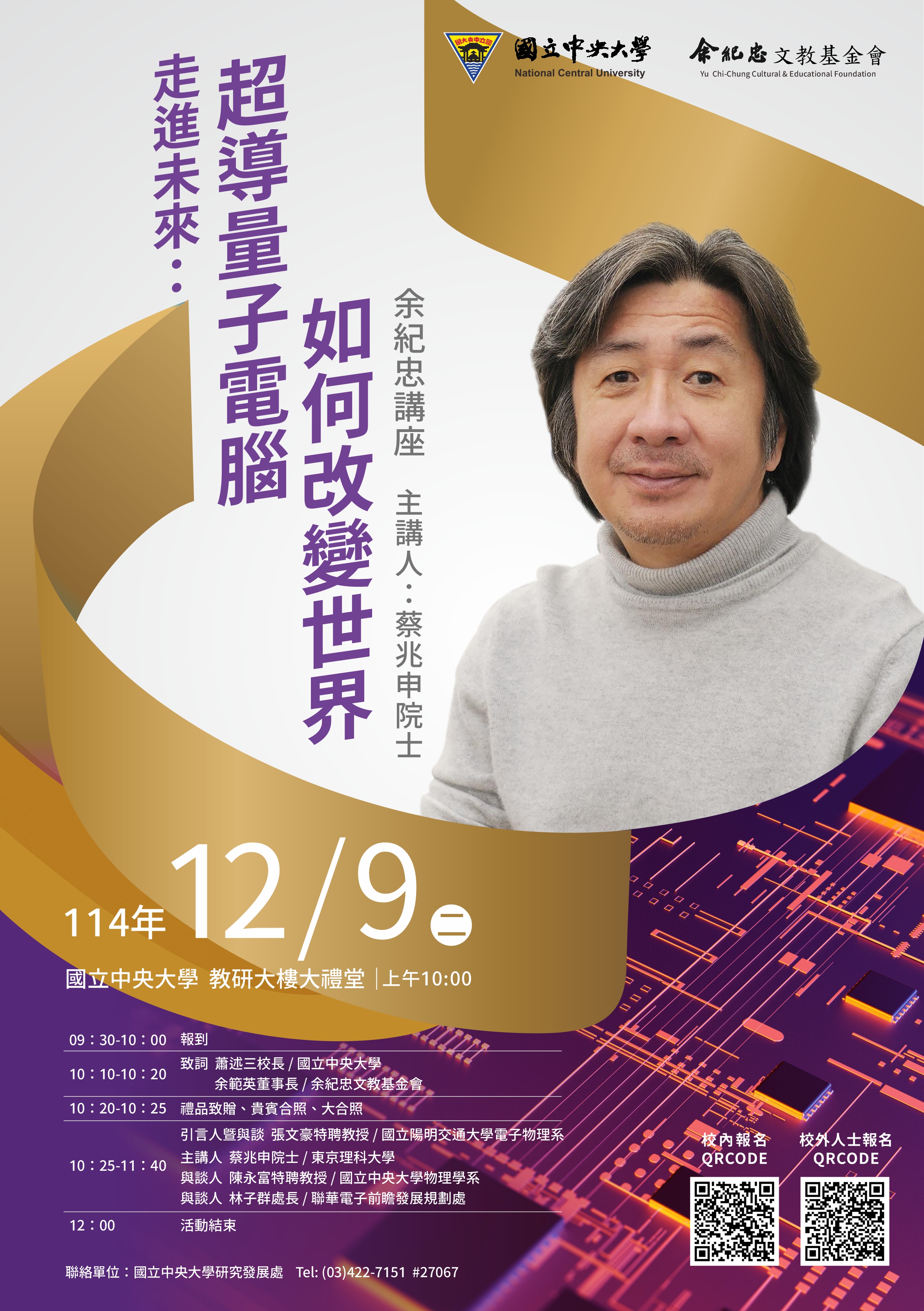 國立中央大學謹訂於114年12月9日(二)辦理「114年余紀忠講座-走進未來:超導量子電腦如何改變世界」,敬邀貴校教職員生踴躍參加