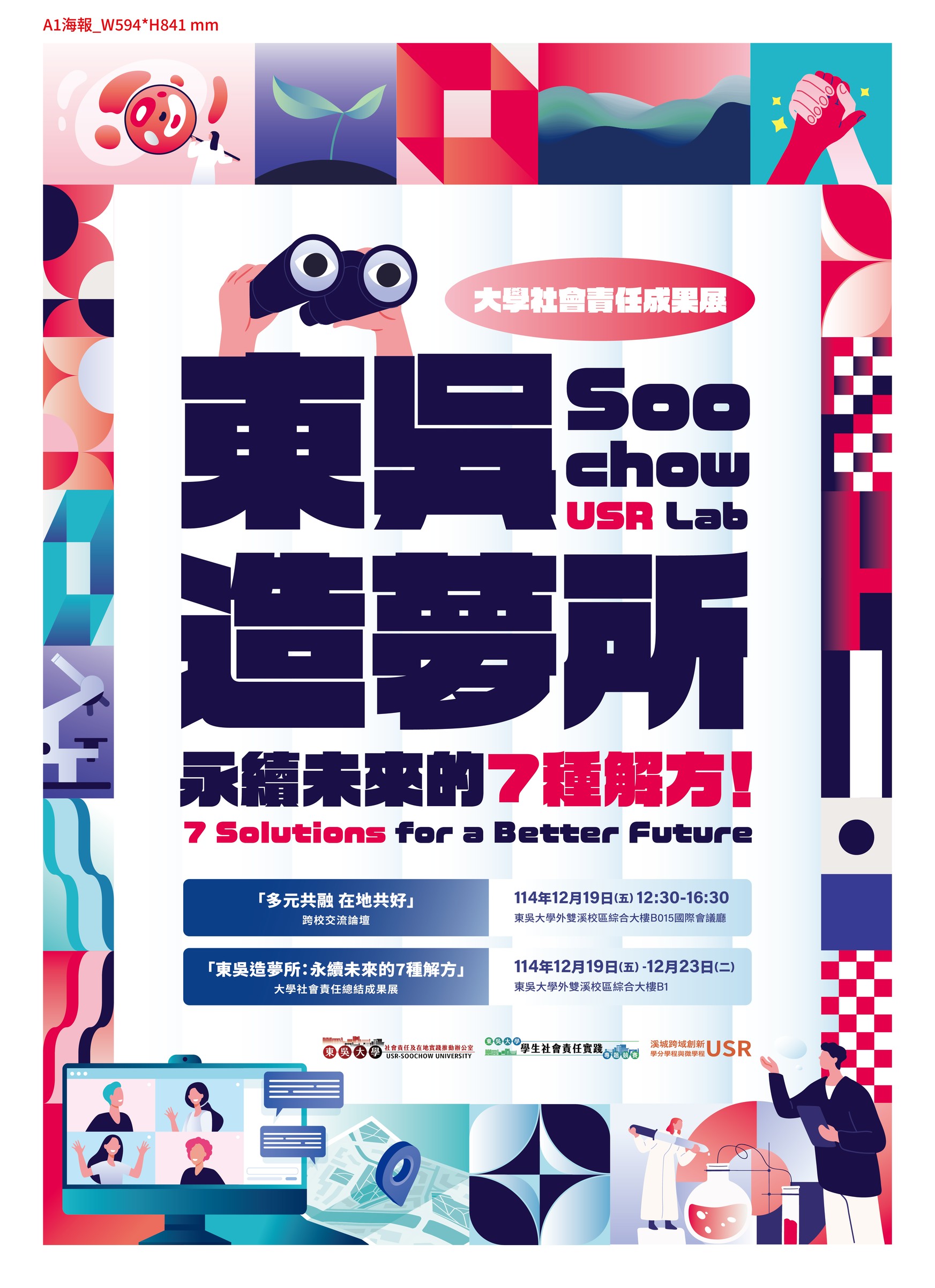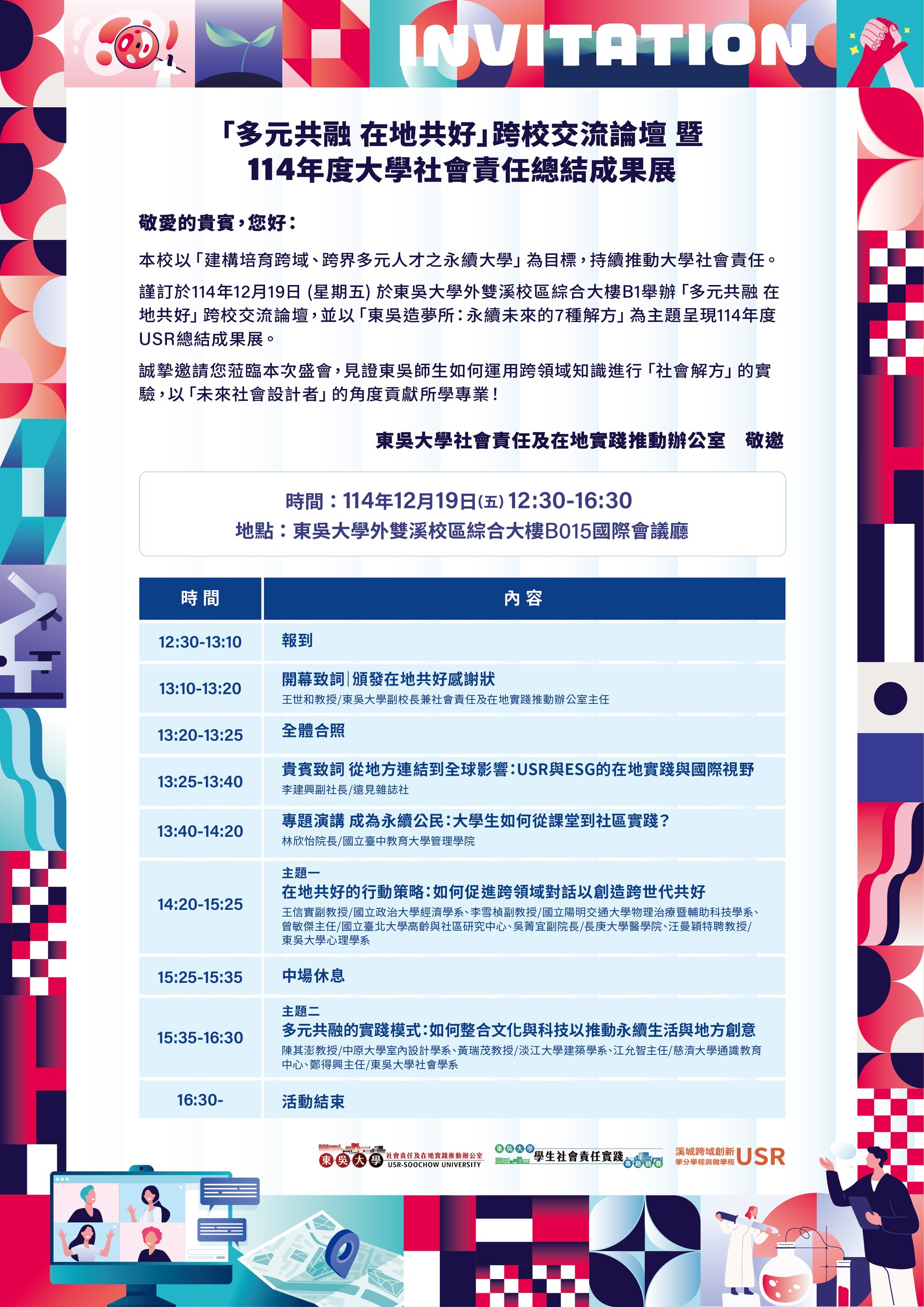 一、東吳大學於114年12月19日辦理「多元共融,在地共好」跨校交流論壇暨大學社會責任總結成果展。 二、活動訊息: (一)論壇時間/地點:114年12月19日(五)下午13:10至16:30/東吳大學外雙溪校區綜合大樓B015國際會議廳(台北市士林區臨溪路70號)。 (二)成果展時間/地點:114年12月19日(五)至114年12月23日(二)/東吳大學外雙溪校區綜合大樓B1。 (三)報名網址:https://forms.gle/nzX4tCRAtU6aKEjZA。 (四)聯繫資訊:陳冠霖行政助理,電話(02)2881-9471分機5225。 三、隨函檢附電子邀請卡(含活動議程)及活動海報。