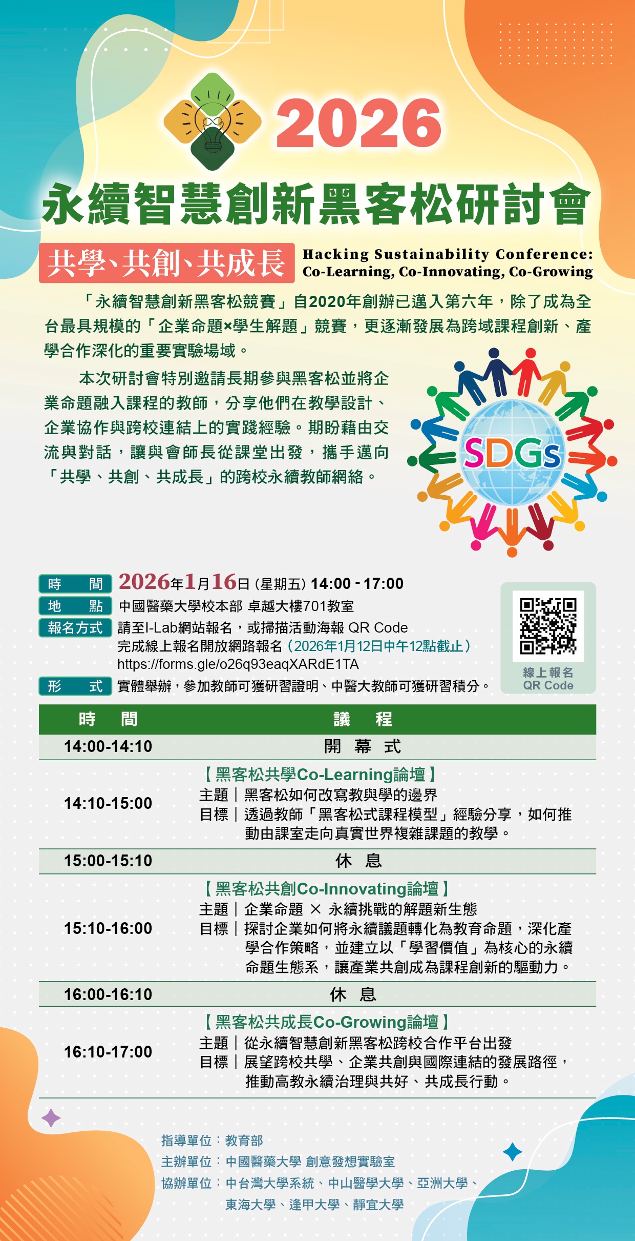 一、「永續智慧創新黑客松競賽」自2020年創辦已邁入第六年,除了成為全台最具規模的「企業命題×學生解題」競賽,更逐漸發展為跨域課程創新、產學合作深化的重要實驗場域。本次「2026永續智慧創新黑客松研討會:共學、共創、共成長」特別邀請長期參與黑客松並將企業命題融入課程的教師,分享他們在教學設計、企業協作與跨校連結上的實踐經驗。鼓勵有興趣教師報名參加,藉由交流與對話,讓與會師長從課堂出發,攜手邁向「共學、共創、共成長」的跨校永續教師網絡。 二、本研習由中醫大創意發想實驗室CMU I-Lab以實體主辦,參與教師可獲研習證明:時間:115年1月16日(五)14:00-17:00;地點:中國醫藥大學校本部(台中市北屯區經貿路一段100號)卓越大樓 701 教室。 三、報名至115年1月12日中午12點截止,議程活動資訊網頁:https://ilab.cmu.edu.tw/news/269