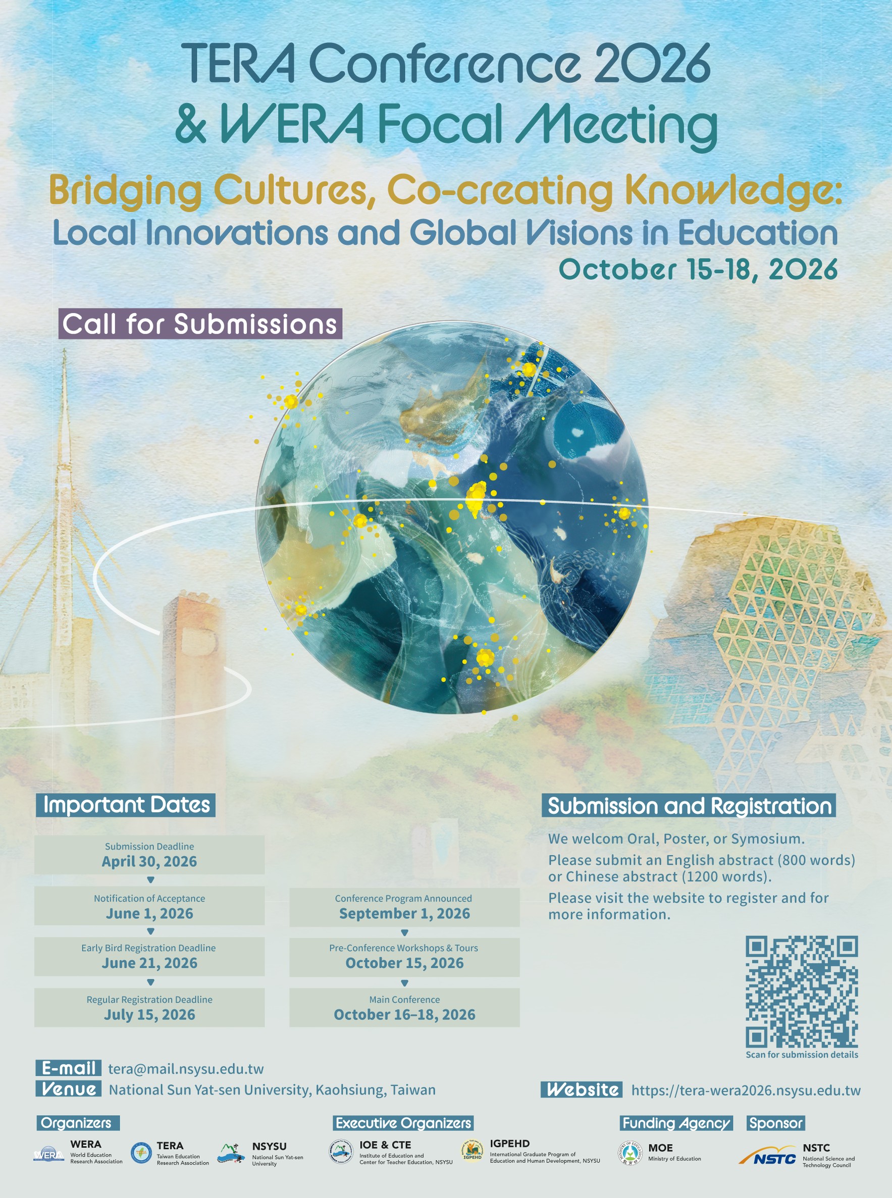 國立中山大學教育研究所、台灣教育研究學會暨世界教育研究學會謹訂於民國115年10月15日至10月18日舉辦「台灣教育研究學會暨世界教育研究學會2026國際學術研討會」(TERA Conference 2026 & WERA Focal Meeting)