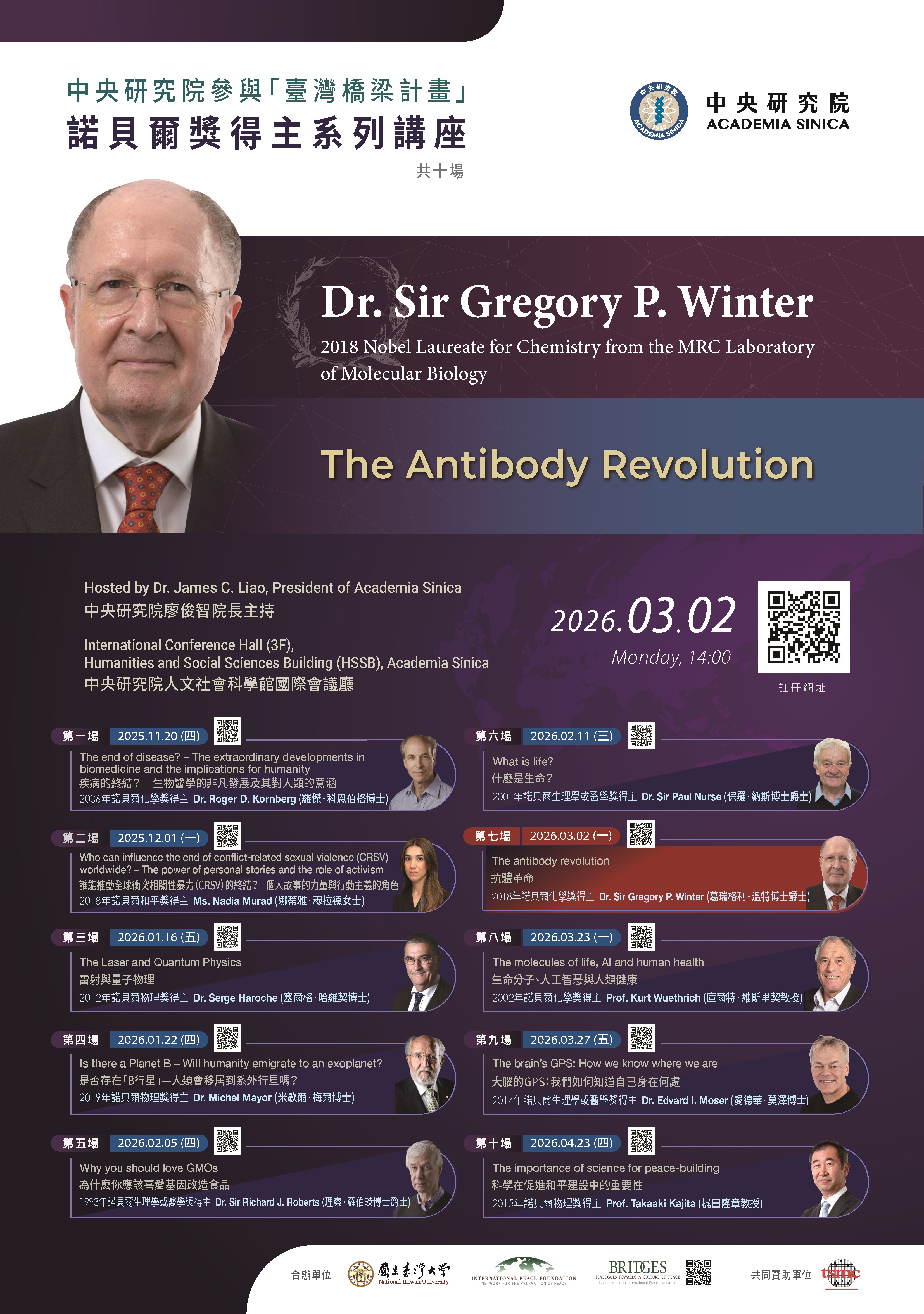 二、中央研究院將邀請其中10位蒞院演講與交流,第七場演講資訊如下: (一)時間:115年3月2日(星期一)下午2時整 (二)地點:中央研究院人文社會科學館國際會議廳 (三)講題:The Antibody Revolution(抗體革命) (四)檢附演講海報電子檔1份。 (五)報名網址:https://forms.gle/NsUpyfiodnVvC92A7。 (六)洽詢專線:中央研究院國際事務處張先生,(02)27899895。
