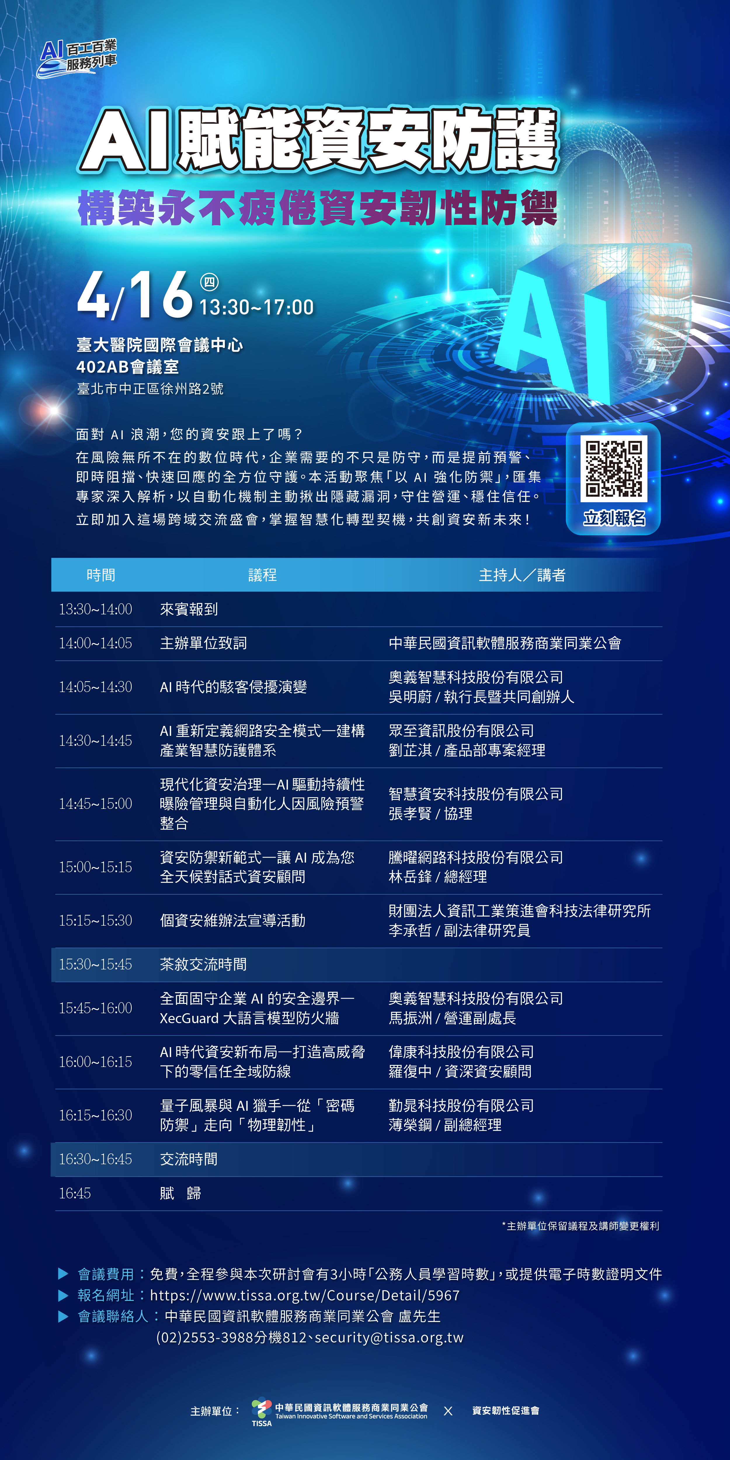 場次二:AI 賦能資安防護(將於115年4月16日(星期四)假臺大醫院國際會議中心402AB,報名網址: https://www.tissa.org.tw/Course/Detail/5967)