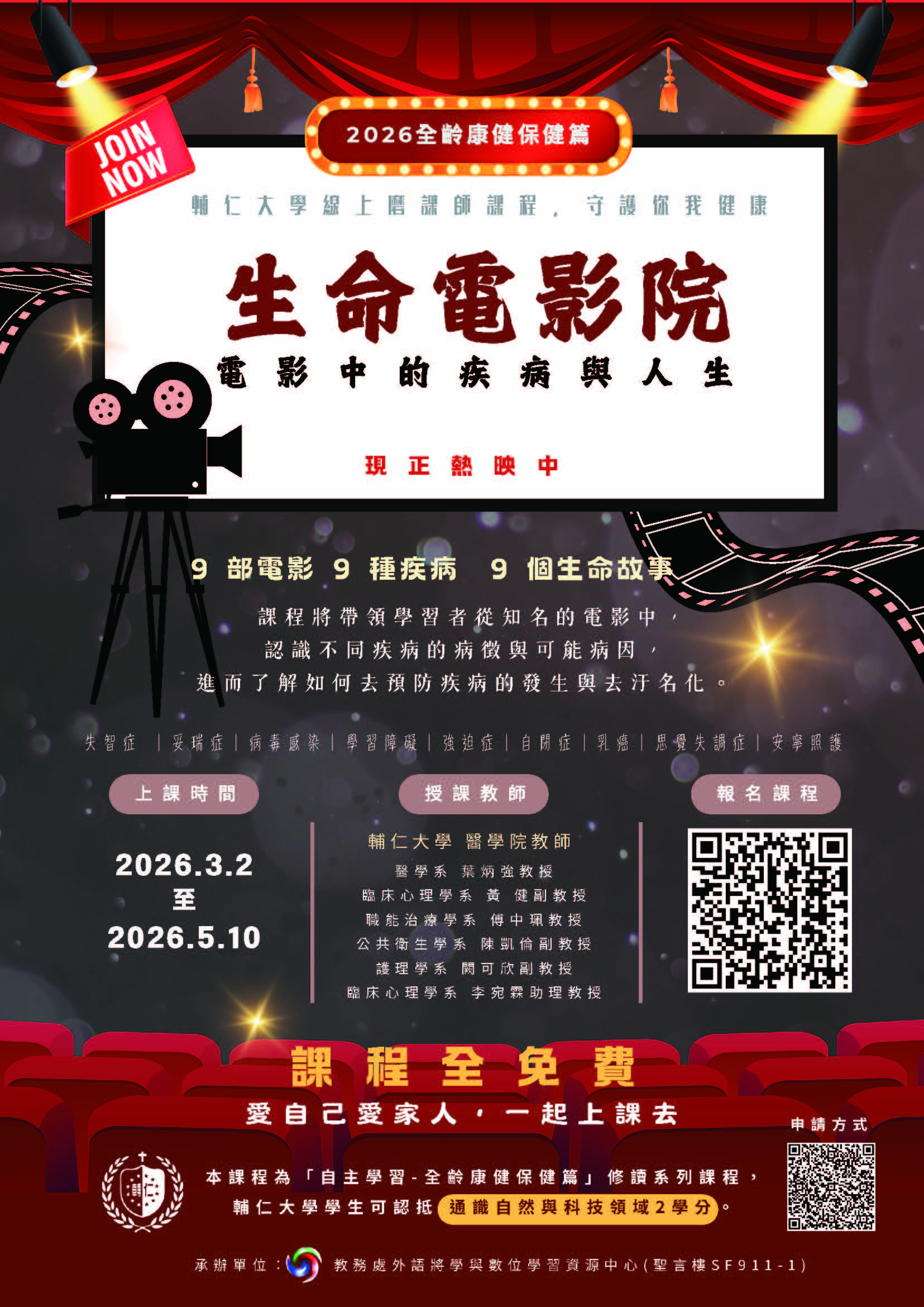 一、課程資訊 (一)BI達人養成―大數據分析及視覺化實戰 1、開課日期:即日起至115年5月10日 2、課程資訊網址:https://reurl.cc/18Q4X8 (二)心靈不簡單 1、開課日期:即日起至115年5月3日 2、課程資訊網址:https://reurl.cc/X2XkZg (三)營養不能少 1、開課日期:即日起至115年5月3日 2、課程資訊網址:https://reurl.cc/EmKzVK (四)身體不思議 1、開課日期:即日起至115年5月3日 2、課程資訊網址:https://reurl.cc/npV0mD (五)生命電影院-電影中的疾病與人生 1、開課日期:即日起至115年5月10日 2、課程資訊網址:https://reurl.cc/Z2n74M (六)世界正在對你說話-基礎符號學入門 1、開課日期:即日起至115年5月10日 2、課程資訊網址:https://reurl.cc/18Q4KV 二、各課程全程免費,不限修課對象,完成課程修讀後,即可獲得修課證明。 三、檢附課程文宣海報,敬請協助公告宣傳。 四、聯絡方式:本校教務處外語教學與數位學習資源中心盧小姐,電話(02)2905-3175,fj03619@mail.fju.edu.tw。