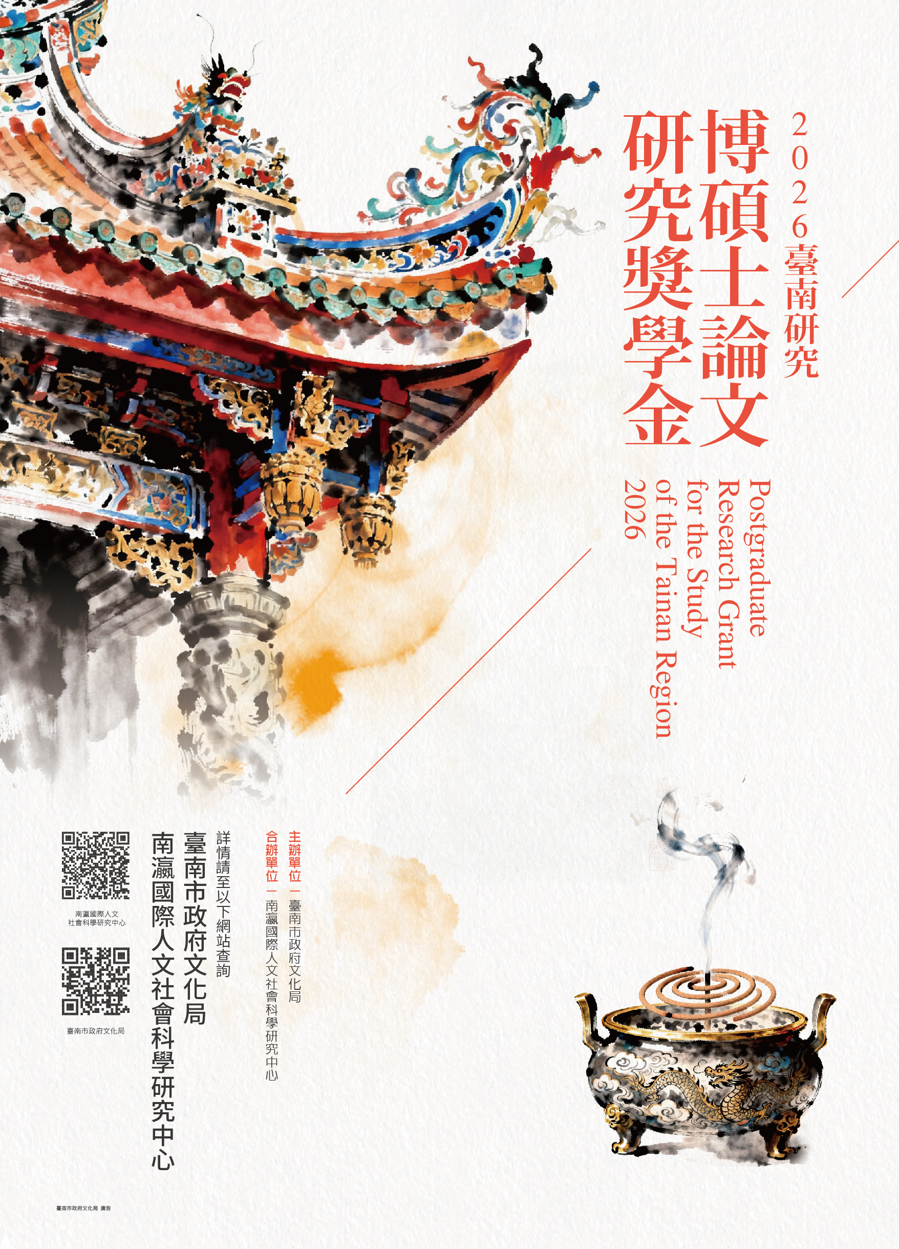 一、臺南市政府文化局「2026臺南研究博碩士論文研究獎學金」徵件。 二、徵件訊息: (一)申請資格:經教育部立案國內、外大學或獨立學院之碩士班研究生及博士候選人,論文須預計於 2027 年至 2028 年間完成。不限國籍皆可申請,惟 2026 年(含)以前畢業者,不得申請。 (二)研究範圍:以臺南地區人文與社會科學、或以臺南地區與臺灣或國外其他地區進行比較研究之學位論文計畫。 (三)獎助名額及金額 1、博士班:二名,每名新臺幣十萬元整。 2、碩士班:五名,每名新臺幣五萬元整。 (四)申請期間:即日起至115年5月31日止。 (五)申請辦法請詳閱附件,或至臺南市文化局官網(https://culture.tainan.gov.tw/)、南瀛國際人文社會科學研究中心(https://culture.tainan.gov.tw/theme/latestevent/index?Parser=9,50,351)查詢。 三、隨文檢附實施要點、徵件海報各1份。
