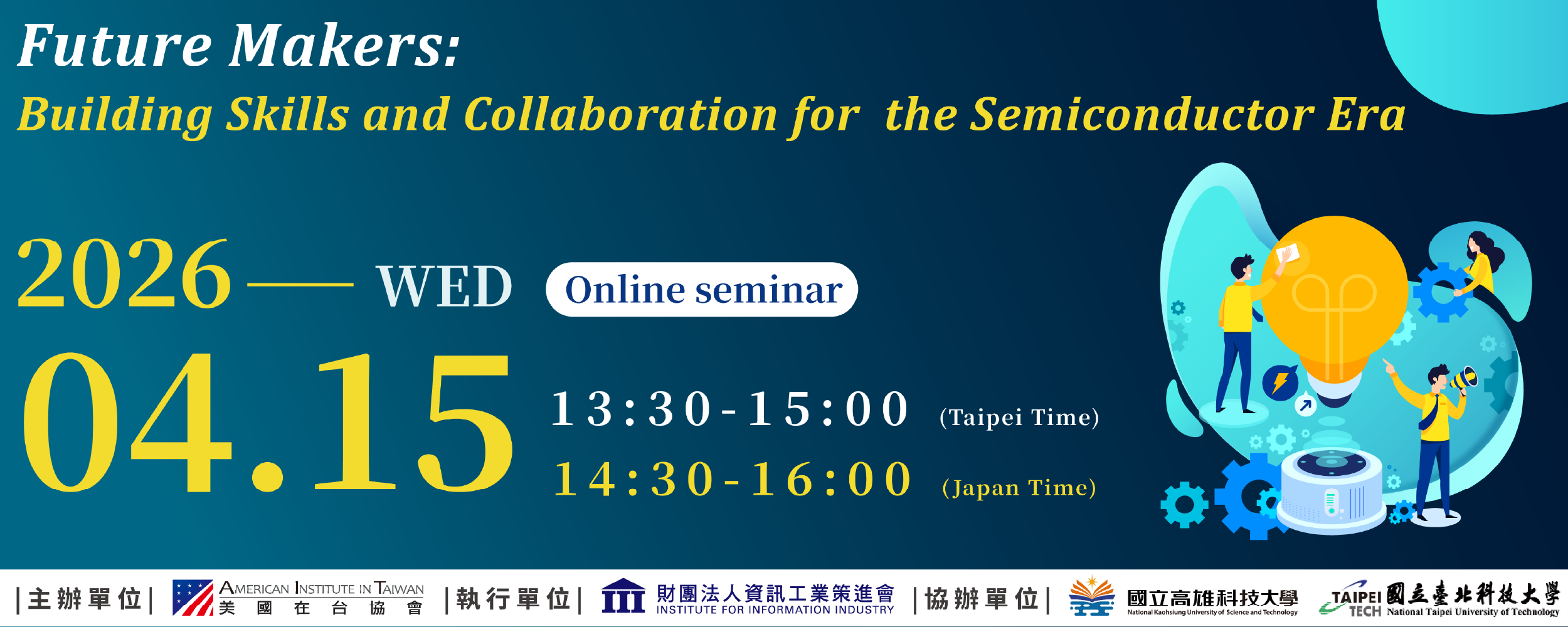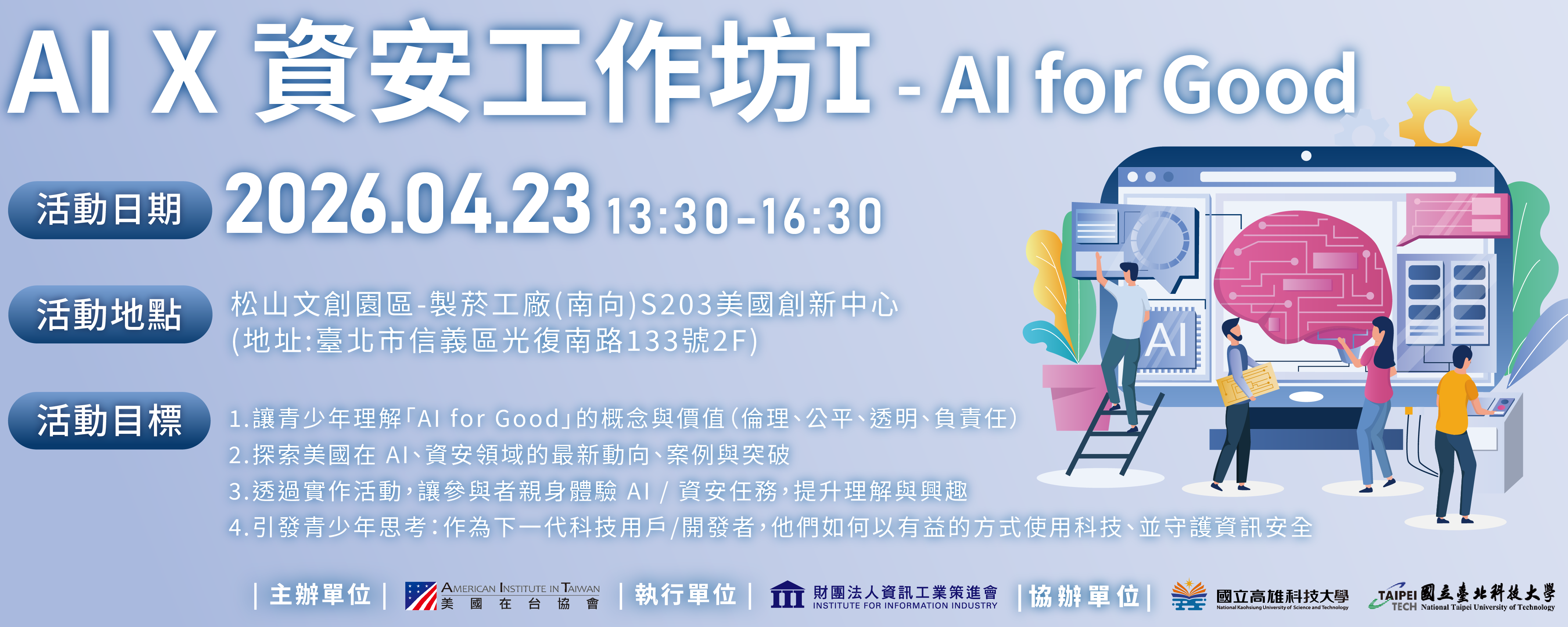 二、活動資訊: (一)、線上論壇:1.活動名稱:「未來創客:建構半導體時代的技能與協作(Future Makers: Building Skills and Collaboration for the Semiconductor Era)」。2.活動時間:中華民國115年4月15日(三)下午13:30~15:00。3.報名時限:自即日起至115年4月10日(五)止。4.報名網址:https://ievents.iii.org.tw/EventS.aspx?t=0&id=3142。 (二)、實體工作坊:1.活動名稱:「AI x 資安工作坊Ⅰ- AI for Good」。2.活動時間:中華民國115年4月23日(四)下午13:30~16:30。3.活動地點:松山文創園區-製菸工廠(南向)S203美國創新中心,地址:臺北市信義區光復南路133號2F。4.報名時限:自即日起至115年4月17日(五)止。5.報名網址:https://ievents.iii.org.tw/EventS.aspx?t=0&id=3125。
