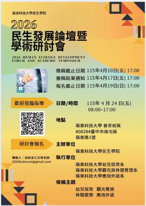 一、本校民生學院訂於115年4月24日(星期五)舉辦「2026民生發展論壇暨學術研討會」。 二、辦理地點為嶺東科技大學春安校區(臺中市南屯區嶺東路1號)。 三、論壇聚焦觀光餐旅、休閒遊憩、應用外語及幼兒保育等相關領域,促進跨域學術交流與產學合作發展。 四、採摘要審查制,經審查通過者須於會議當日進行口頭發表,並於當日公布優秀論文獎得獎名單。 五、重要時程如下: (一)摘要投稿截止:115年4月10日(星期五)17時整。 (二)審查結果通知:115年4月17日(星期五)17時整。 (三)報名截止:115年4月19日(星期日)17時整。 六、徵稿主題、稿約規定及投稿方式詳如附件,或參閱下列網址: (一)報名及投稿網址:https://forms.gle/hhEvTbkWTviKtq5U8。 (二)附件下載:https://cce.ltu.edu.tw/p/406-1037-16528,r362.php?Lang=zh-tw。 七、聯絡人:江文瑋老師,電子信箱:2026ltuforum@gmail.com。