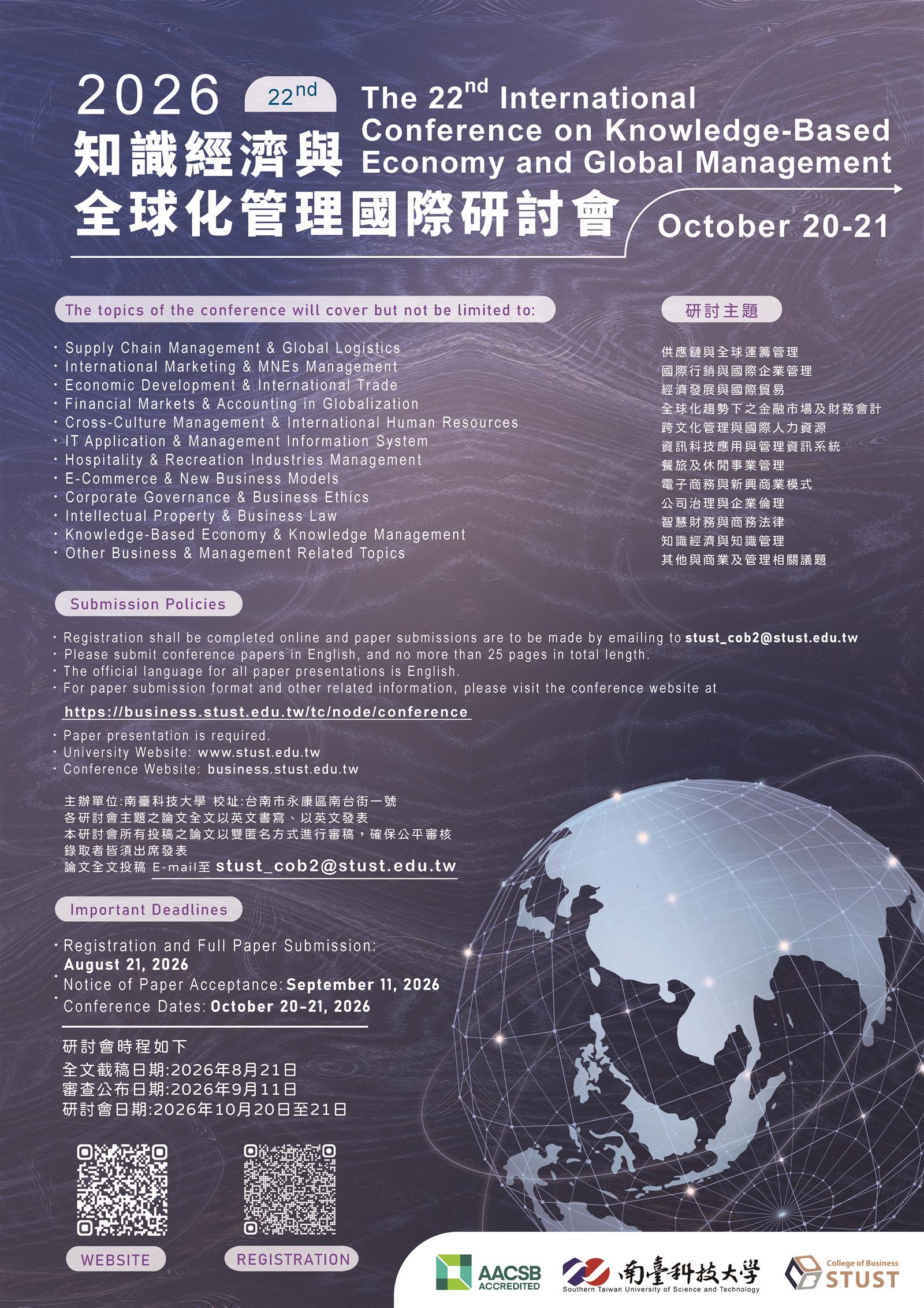 南臺學校財團法人南臺科技大學主辦「2026第二十二屆知識經濟與全球化管理國際研討會」訂於115年10月20日至21日舉行,徵稿相關資料如附件,並請鼓勵貴校師生踴躍投稿參加