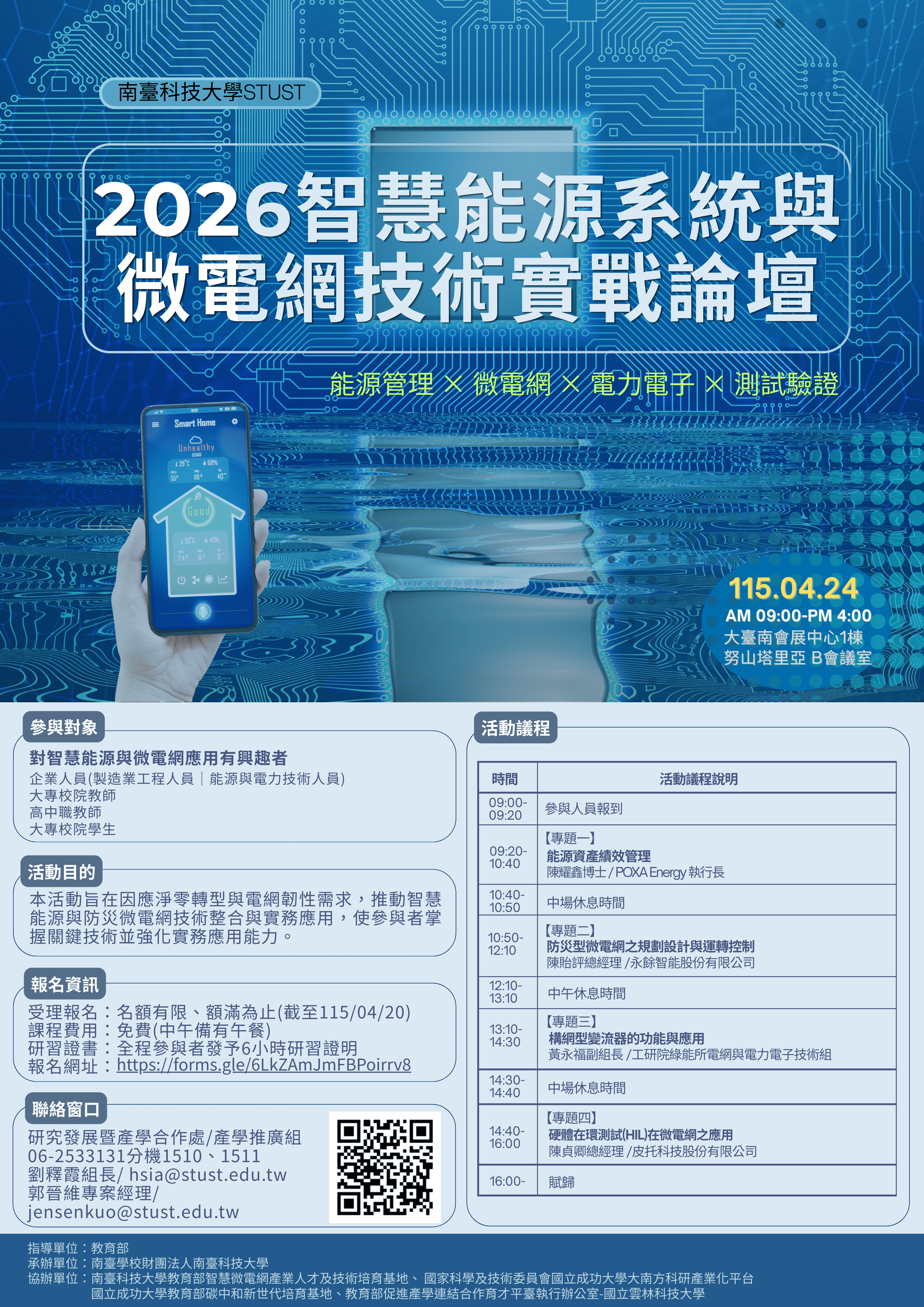 一、為推動教育部「區域產業人才及技術培育基地計畫」之智慧微電網產業人才及技術培育基地計畫辦理。 二、活動資訊: (一)活動日期:115年04月24日(星期五) (二)活動時間:上午9:00~下午4:00 (三)活動地點:大臺南會展中心1棟努山塔里亞B會議室(臺南市歸仁區歸仁十二路3號) 三、參與對象:對智慧能源與微電網應用有興趣者 (一)企業人員 (二)大專校院教師 (三)高中職教師 (四)大專校院學生 四、報名資訊: (一)受理報名:名額有限、額滿為止(截至115/04/20) (二)課程費用:免費(中午備有午餐)(三)研習證書:全程參與者發予6小時研習證明 (四)報名網址:https://forms.gle/6LkZAmJmFBPoirrv8 五、聯絡窗口:研究發展暨產學合作處/產學推廣組06-2533131分機1510、1511劉釋霞組長/ hsia@stust.edu.tw郭晉維專案經理/ jensenkuo@stust.edu.tw