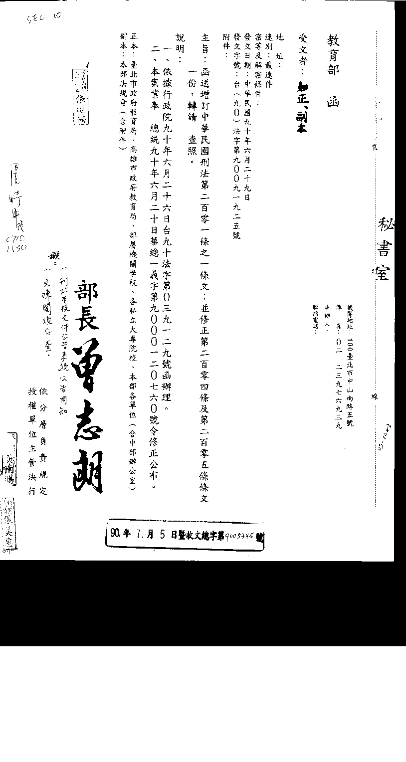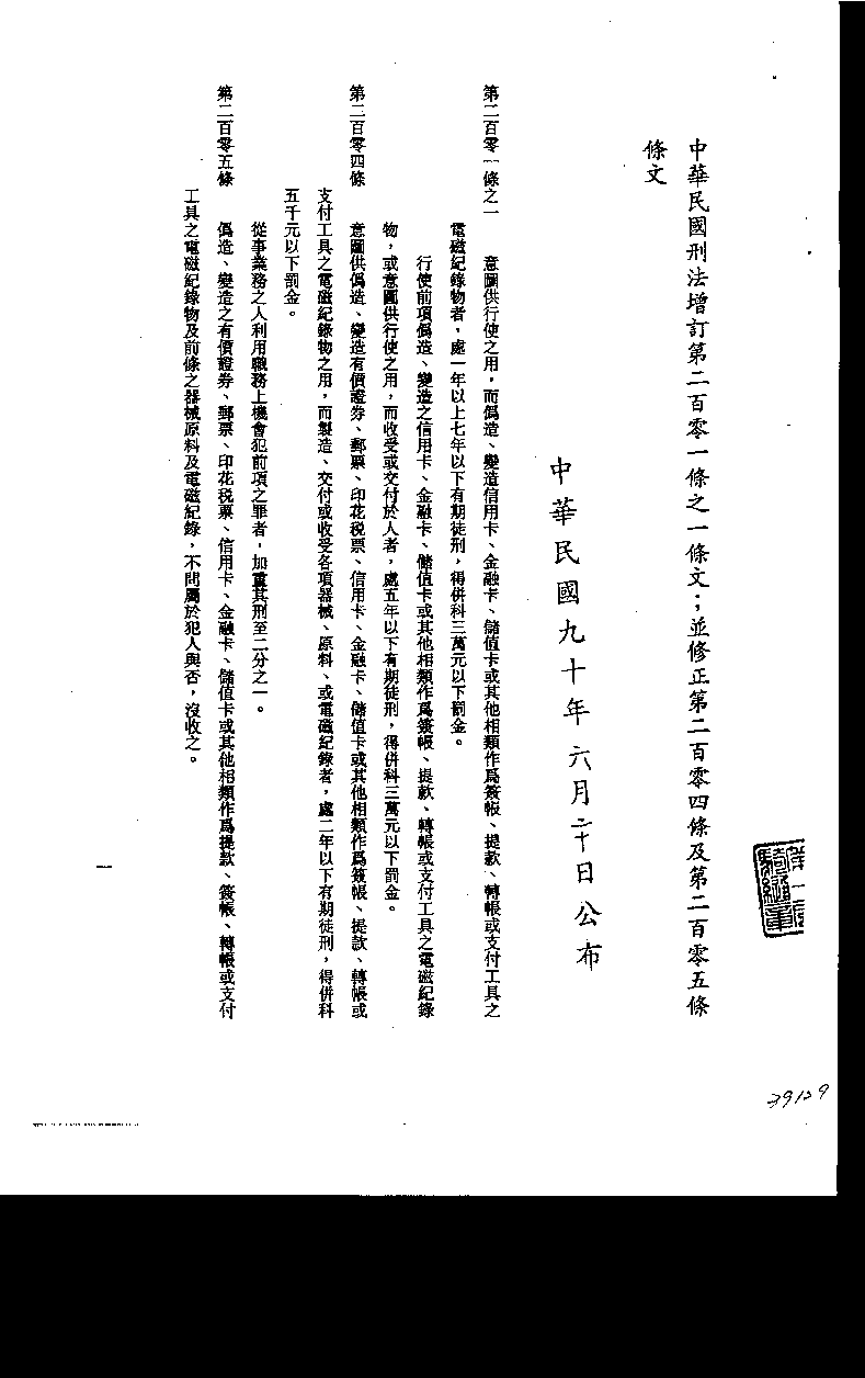 法令規章全名:增訂中華民國刑法第201-1條、修正第204條及第205條條文 頒定日期:中華民國九十年六月二十日 頒定字號:九十年六月二十日華總一義字第九○○○一二○七六○號令修正公佈