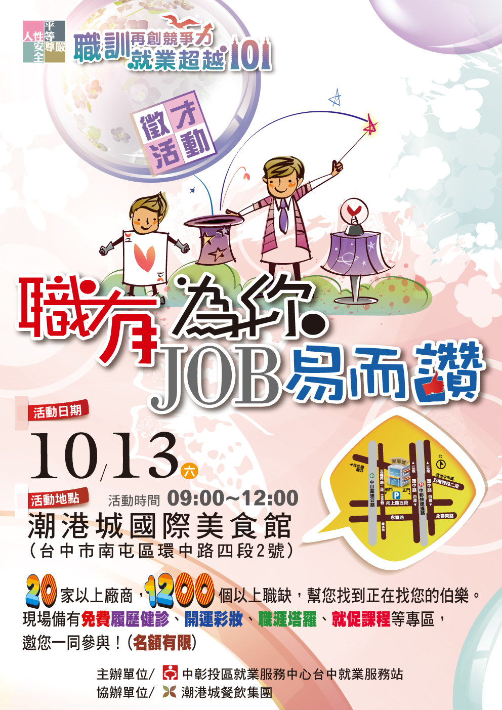 ☆活動日期:101年10月13日(星期六) 9時至12時 ☆活動地點:潮港城國際美食館(台中市南屯區環中路四段2號) 本活動分為五大主題專區: 1、 徵才活動專區 2、 履歷健診專區 3、 開運彩妝專區 4、 職涯塔羅占占看專區 5、 就業促進研習課程專區