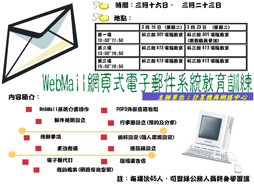 承辨單位:計算機與網路中心 承辨人:黃景煌、陳江維 發文日期:92.03.11 主旨:webmail電子郵件系統教育訓練 說明:推廣本校webmail系統,提供更便捷的功能,詳情如附件。