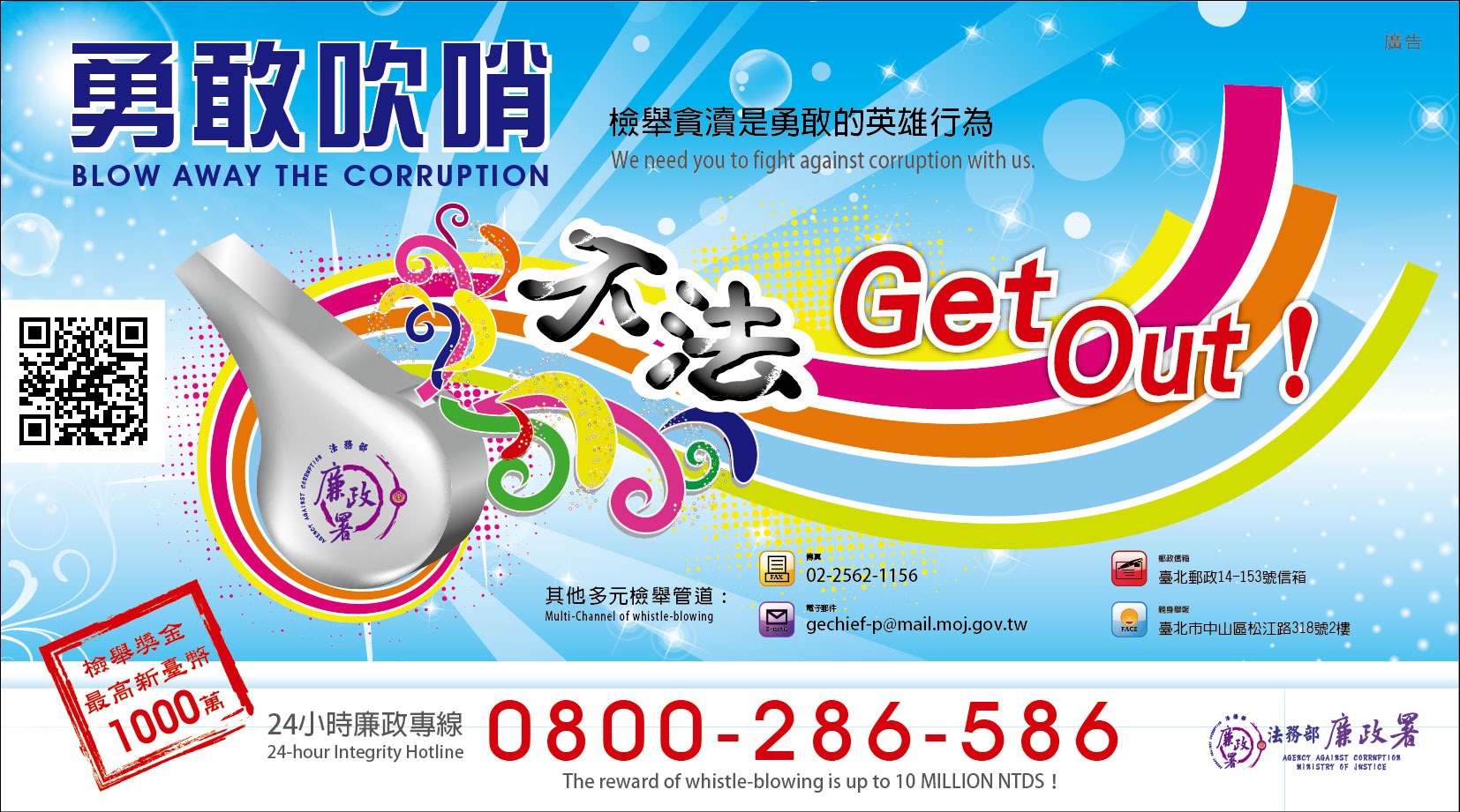 檢送法務部廉政署製作「勇敢吹哨 不法GET OUT」宣導廣告,敬請下載點閱。