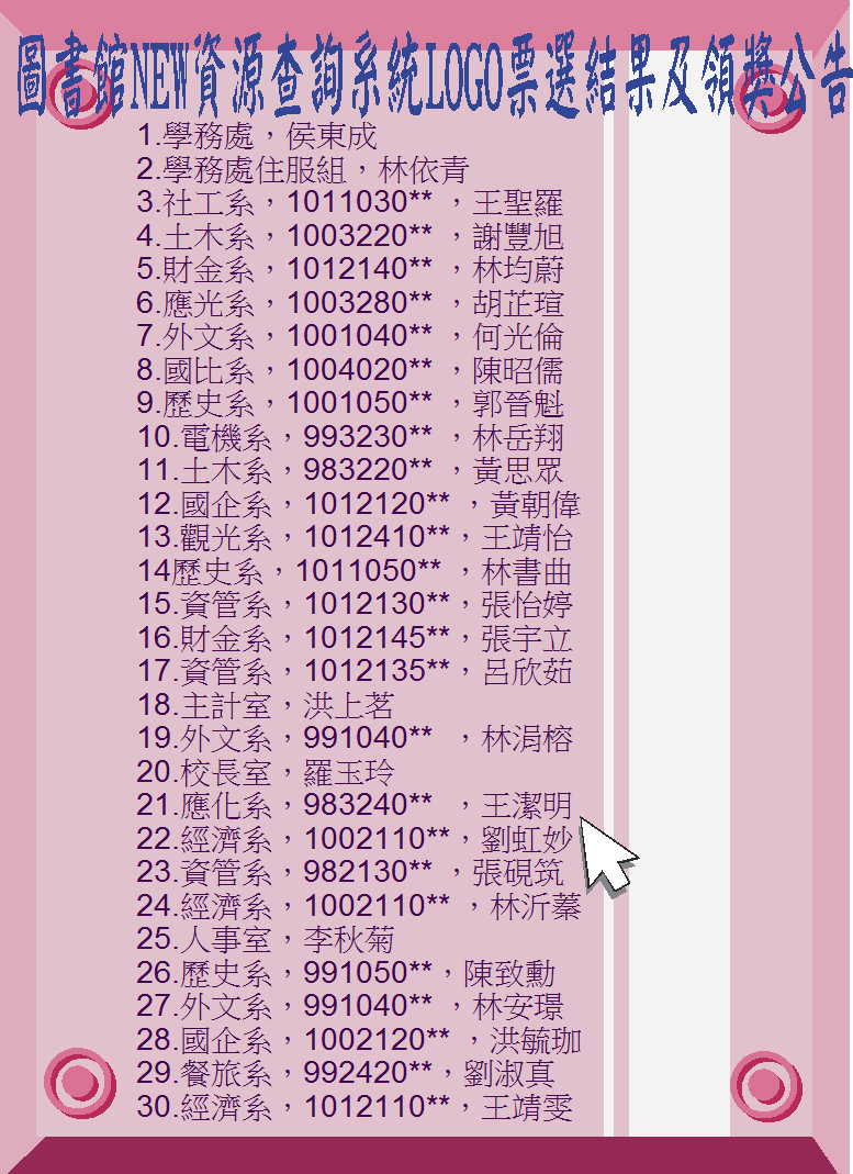 同時,也要特別感謝熱情參與此次logo線上投票活動的師生,已由系統隨機抽出30名獲獎名單(如附檔),敬請於6/10(一)-7/10(一)期間至圖書館一樓前方服務櫃檯,領取圖書館為您準備的精美禮物乙份,逾期未領者,視同放棄。
