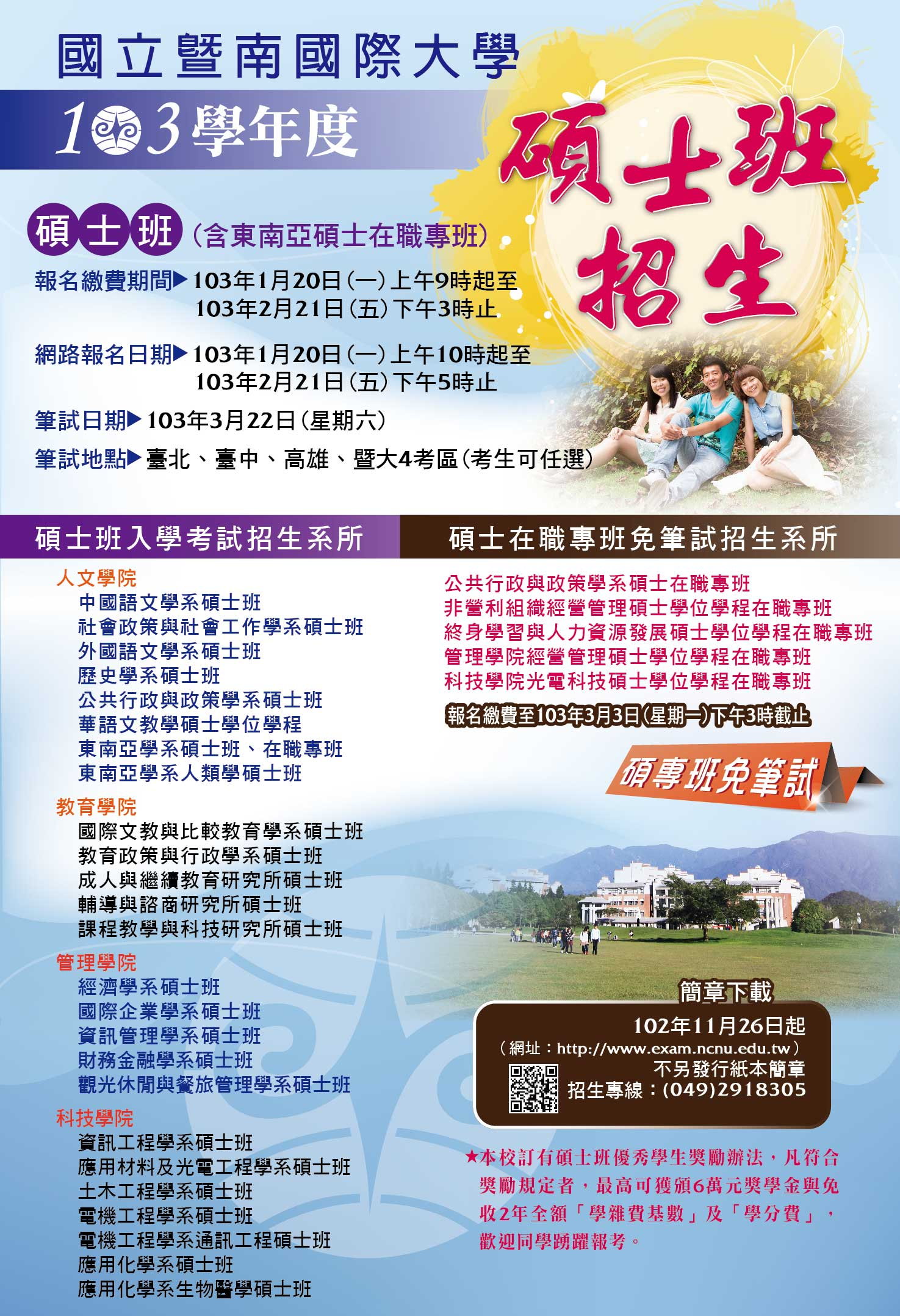 一、本校103學年度碩士班、免筆試碩士在職專班招生簡章已上傳「網路報名系統」,歡迎下載(網址:http://www.exam.ncnu.edu.tw)。 二、碩士班(含東南亞學系碩士在職專班) 網路報名日期:103.01.20~103.02.21 筆試日期:103.03.22(星期六) 筆試考區:台北(台師大)、台中(明德女中)、暨大、高雄(高雄中學),報名時可自選。 三、免筆試碩士在職專班,招生系所:公行系、非營利組織、終身學習、經營管理、光電科技等5個在職專班,僅採書面審查及口試。 網路報名日期:103.01.20~103.03.03 四、本校訂有碩士班優秀學生獎勵辦法,凡符合獎勵規定者,最高可獲頒6萬元獎學金與免收2年全額學雜費及學分費,歡迎同學踴躍報考。