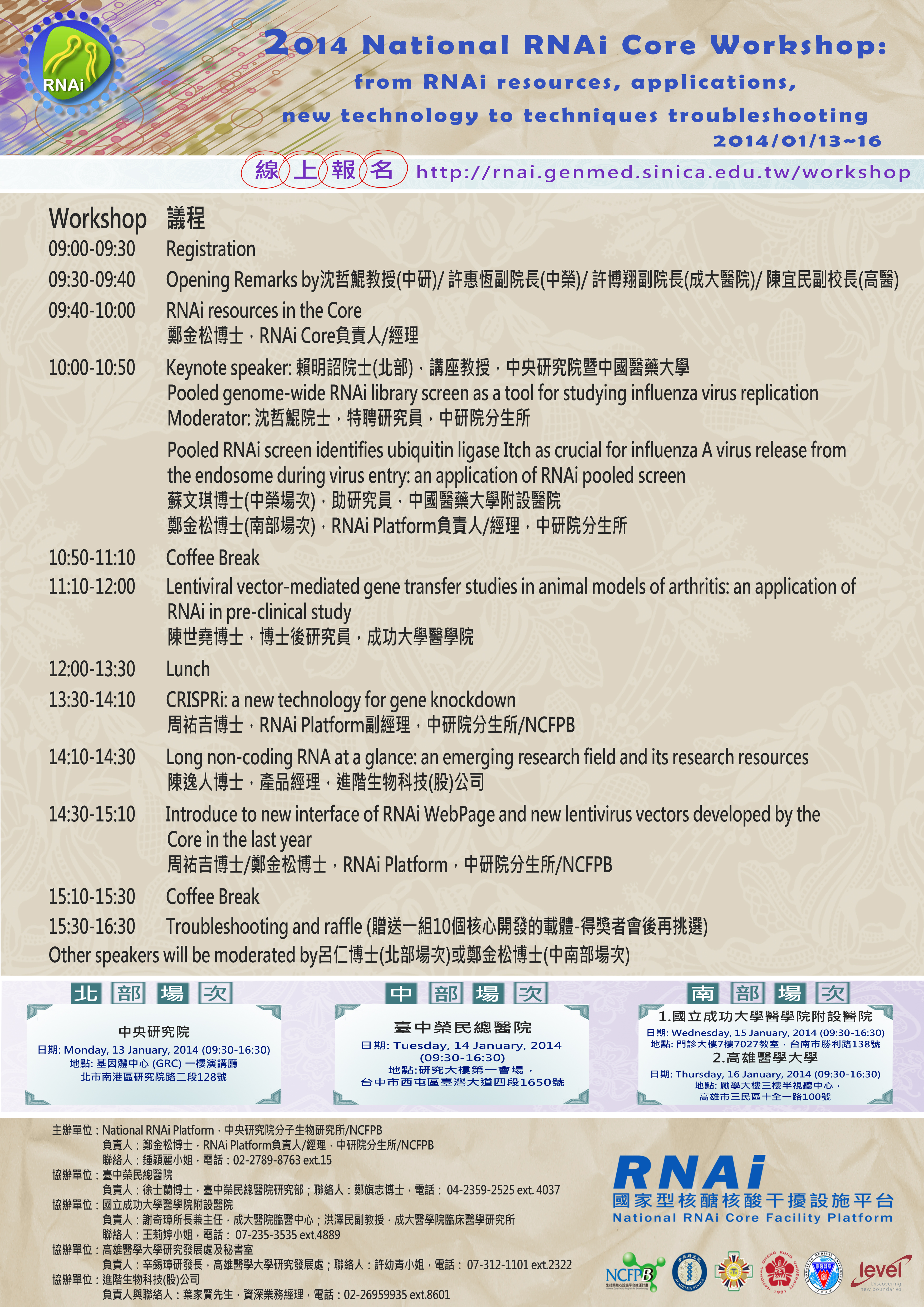 中央研究院國家核糖核酸干擾設施平台(National RNAi Core Facility Platform),將在北中南三區舉行年度研討會。台中場次訂於2014年1月 14日(星期二),假台中榮總研究大樓第一會場舉辦(議程如附件海報)。干擾性核糖核酸 (RNAi) 的應用是一種效率極高的逆向基因研究技術。可應用RNAi的技術,將標的核糖核酸專一性的被降解,或抑制蛋白質轉譯作用。為使此技術能在臺灣被廣泛應用,提升學者的研究動能。中研院於2004年代表臺灣加入美國麻省理工學院/哈佛大學的 Broad 研究所發起的核醣核酸干擾聯盟國際合作計畫(The RNAi Consortium; TRC)至2011年臺灣可從此聯盟接收到,可抑制人類及老鼠各16,000個基因的shRNA/RNAi (10 shRNAs/gene)試劑庫的資料。且可接收全部shRNA/RNAi 試劑庫knockdown的資料。RNAi核心設施的功能主要在維持、分讓此批RNAi試劑,並將此科技於RNAi基因篩選的應用達到最佳的效果。RNAi核心設施,希望能擴大協助生物相關學科研究的進行,敬邀各位先進參與,並請各位先進鼓勵學生踴躍參加此次研討會(請先在線上報名http://rnai.genmed.sinica.edu.tw/workshop)。來參加的人員有機會獲贈大會所提供的贈品(一組10個核心開發的載體)。歡迎各位學者先進的蒞臨。
