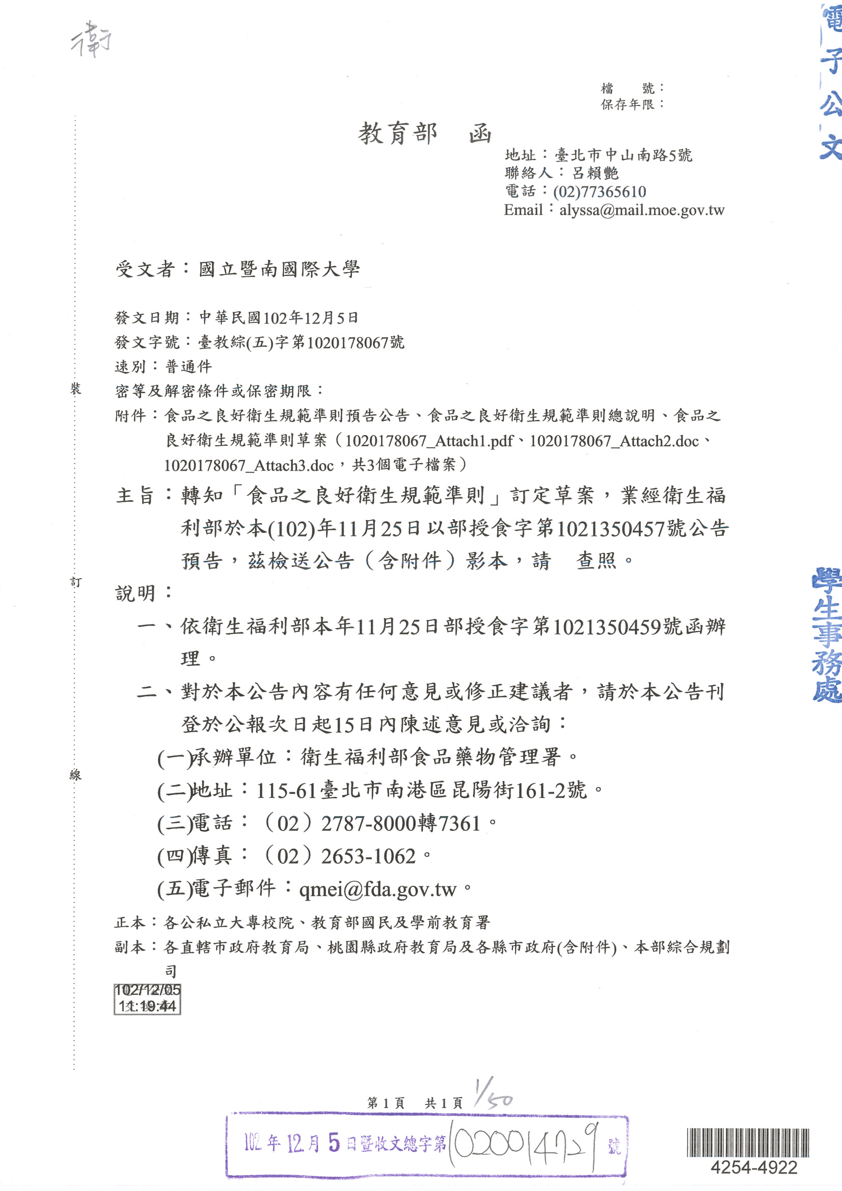 來文機關:教育部 發文日期:中華民國102年12月5日 發文字號:臺教綜(五)字第1020178067號