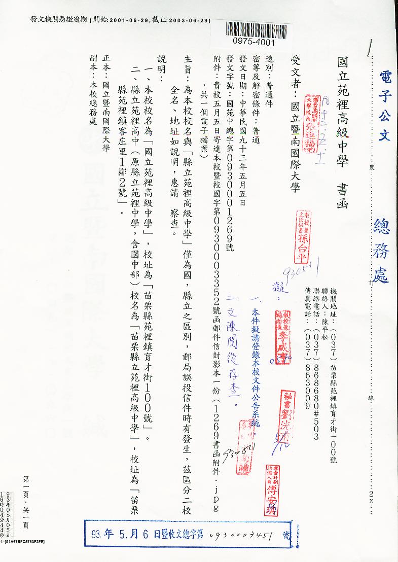 為本校校名與「縣立苑裡高級中學」僅為國,縣立之區別,郵局誤投信件時有發生,茲區分二校全名、地走如說明,惠請 察查。