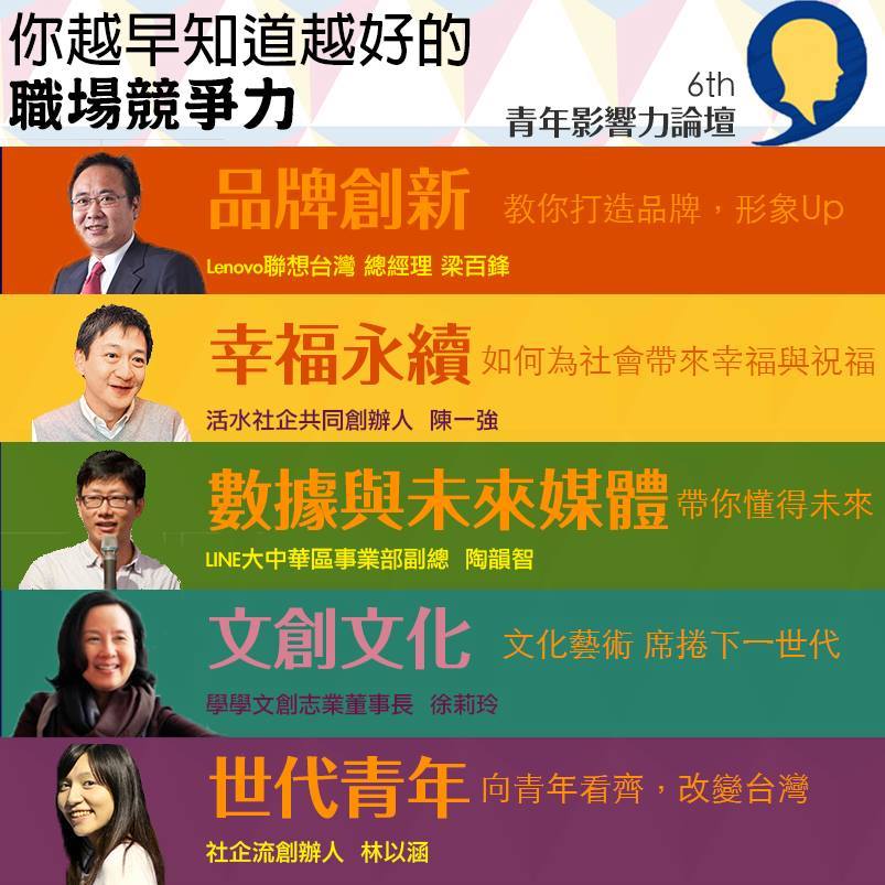 【主題:For Youth By Youth, Our Future Is Now!】 面對種種青年學生皆有的未來困惑,這次論壇讓青年大聲發問,讓社會各界親自來告訴我們,台灣青年人的下一步可以怎麼做!26 位重量級講師齊聚論壇!