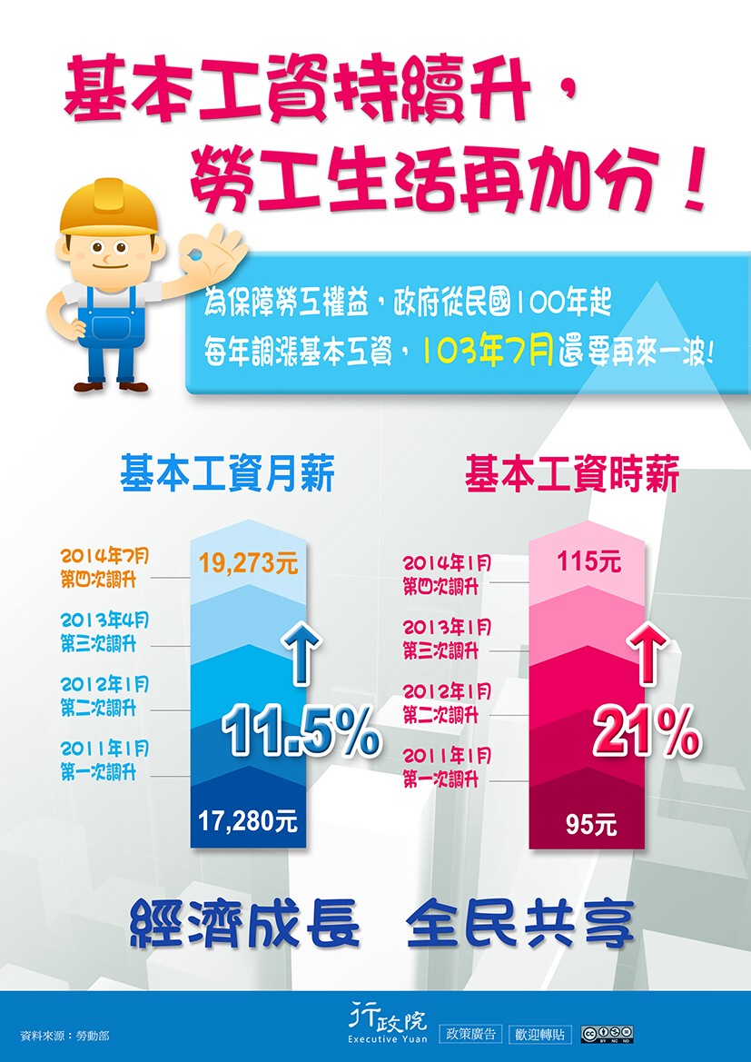 因應物價調漲,為照顧勞工基本生活,行政院自100年起迄今已多次調漲基本工資時薪及月薪,嘉惠全國31萬名時薪勞工及176萬名月薪勞工。 時薪部分從每小時新臺幣95元,經四度調漲,至103年1月1日已來到每小時新臺幣115元,3年內漲幅達到21%; 月薪部分則從每月新臺幣17,280元,經3度調漲,至103年1月1日已來到每月新臺幣19,047元,3年內調升幅度達到10.22% 根據102年9月24日行政院核定基本工資調整案,自103年7月1日起,每月基本工資將再由目前的新臺幣19,047元調至19,273元。此外自103年1月1日起,年度消費者物價指數(CPI)年增率累計達(含)3%以上時,政府將召開下一次審議委員會,檢討是否須調整基本工資。 未來政府會衡酌勞動情勢與經濟發展情況,持續審慎檢討基本工資,以保障勞工基本生活。(以上資料節錄自行政院網站http://www.ey.gov.tw/Link_Content.aspx?n=14F697861C7B758B&s=9D7A0FA083FF27BB)